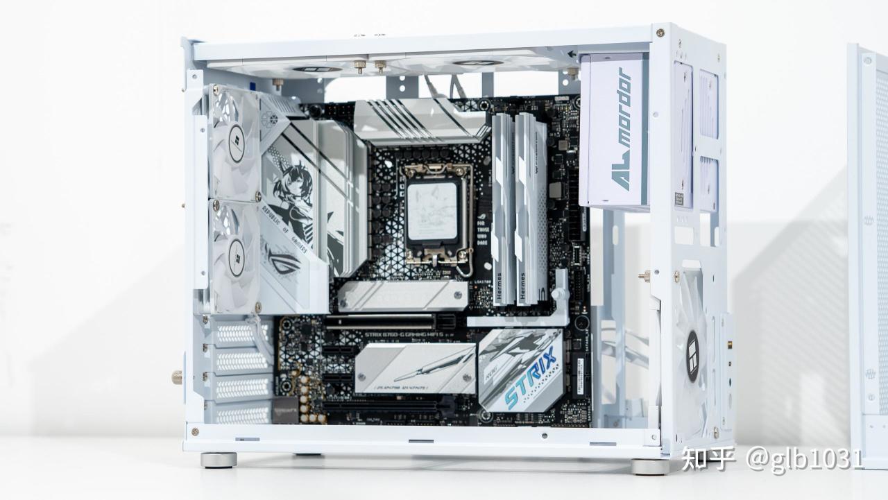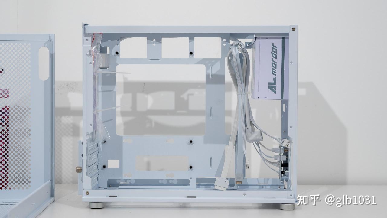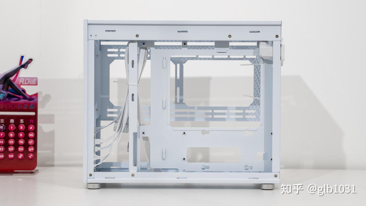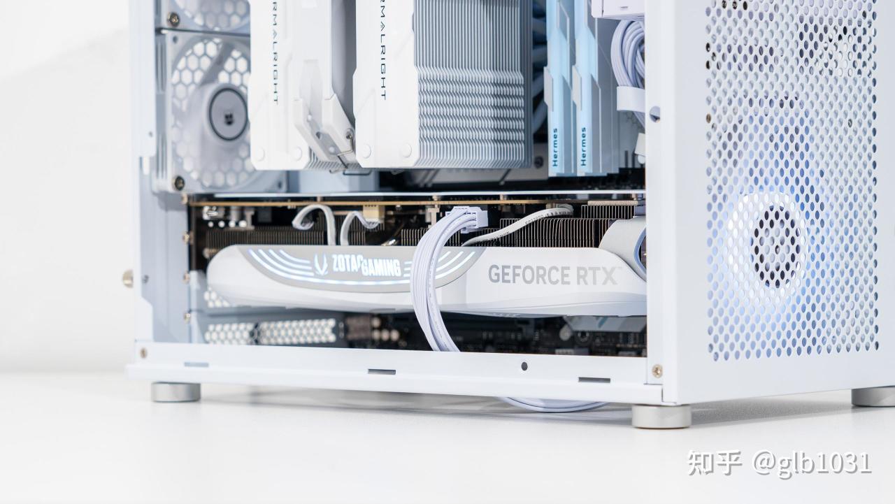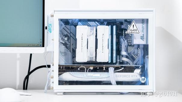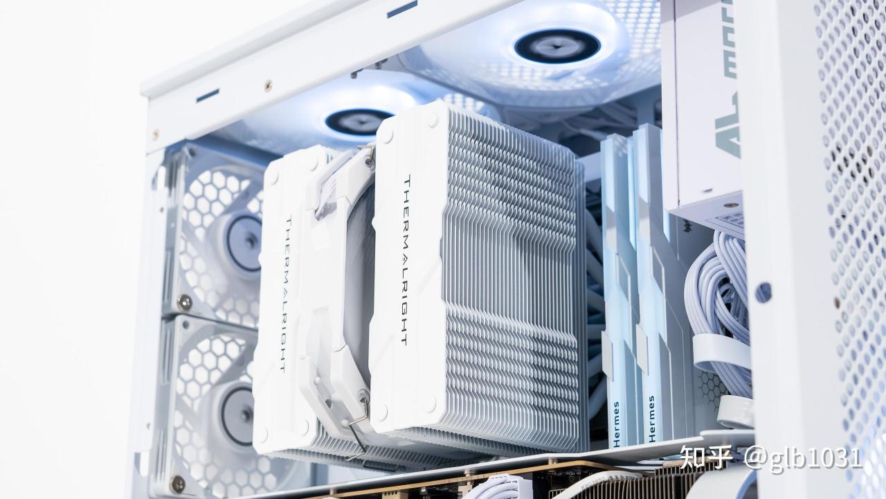 机箱左侧也安排了钢化玻璃面板,可以一眼窥探内部硬件。这里我选择了全白主机的装机方案,搭配了支持ARGB 的利民薄扇在帮助散热的同时作为点缀。