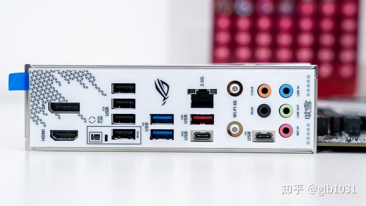 IO 接口方面与前代保持一致,可以看到最大的变化还是WIFI 天线接口采用了华硕最新的易插拔天线接口设计,不过依旧是WIFI 6E 无线网卡。但是因为这会WIFI 7还没在国内普及,因此WIFI 6E 也已经足够玩家日常使用了。