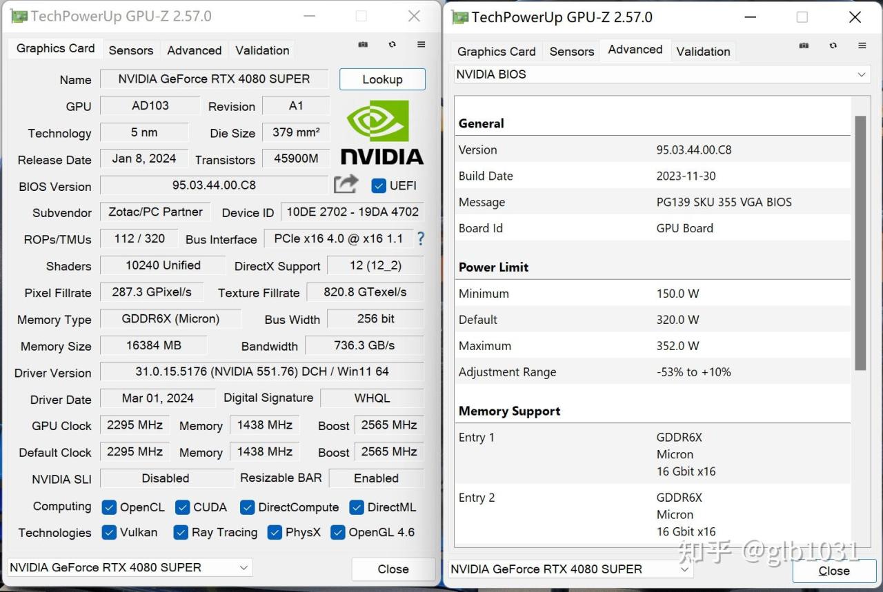 GPUZ 查看索泰 RTX 4080 SUPER TRINITY OC月白基础信息,默认功耗给到了320W,最高可以解锁352W。