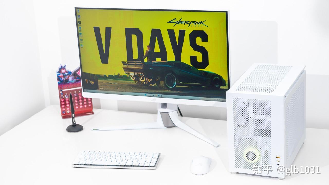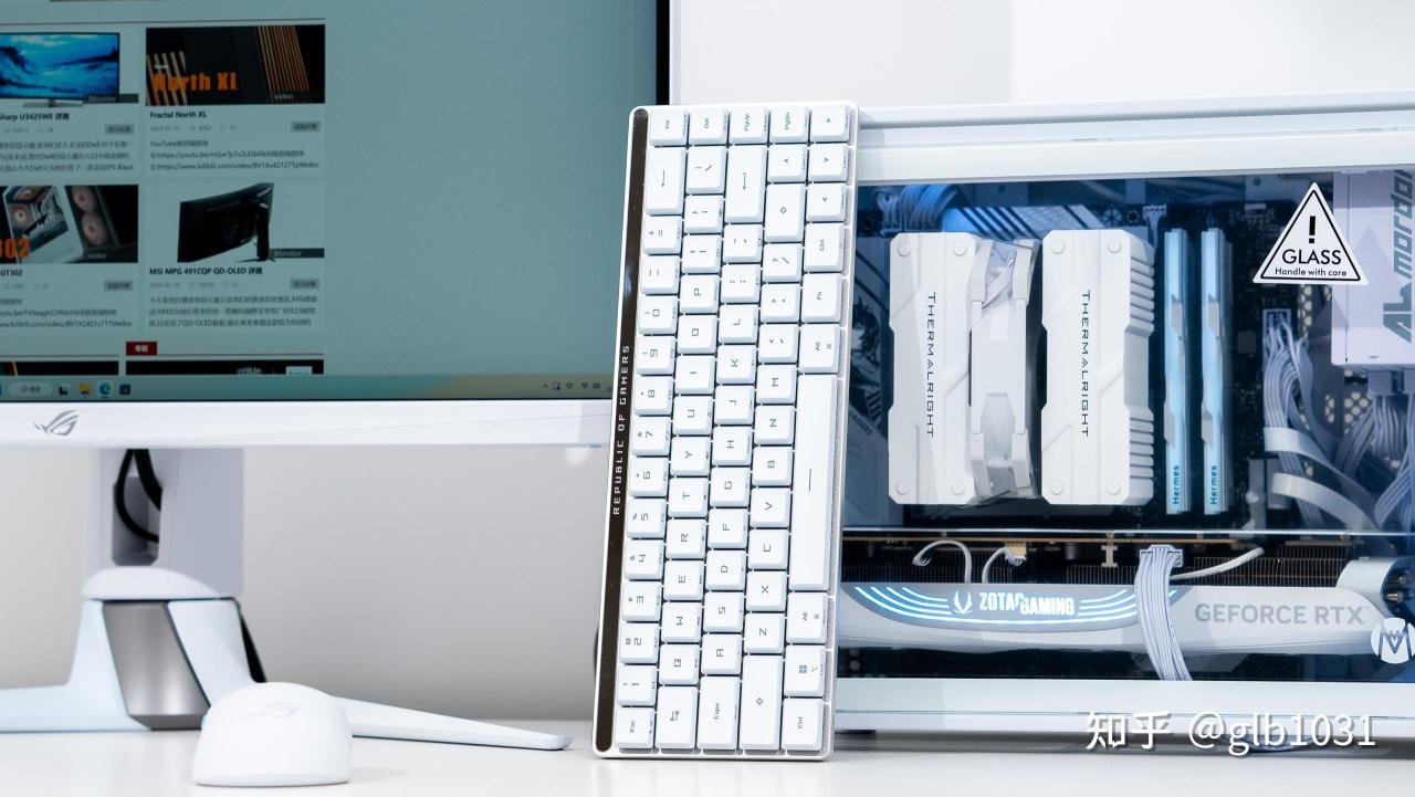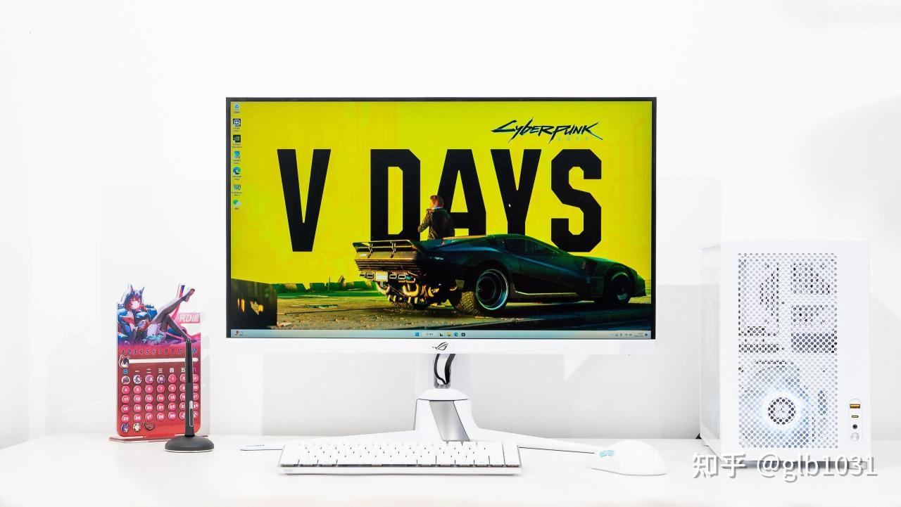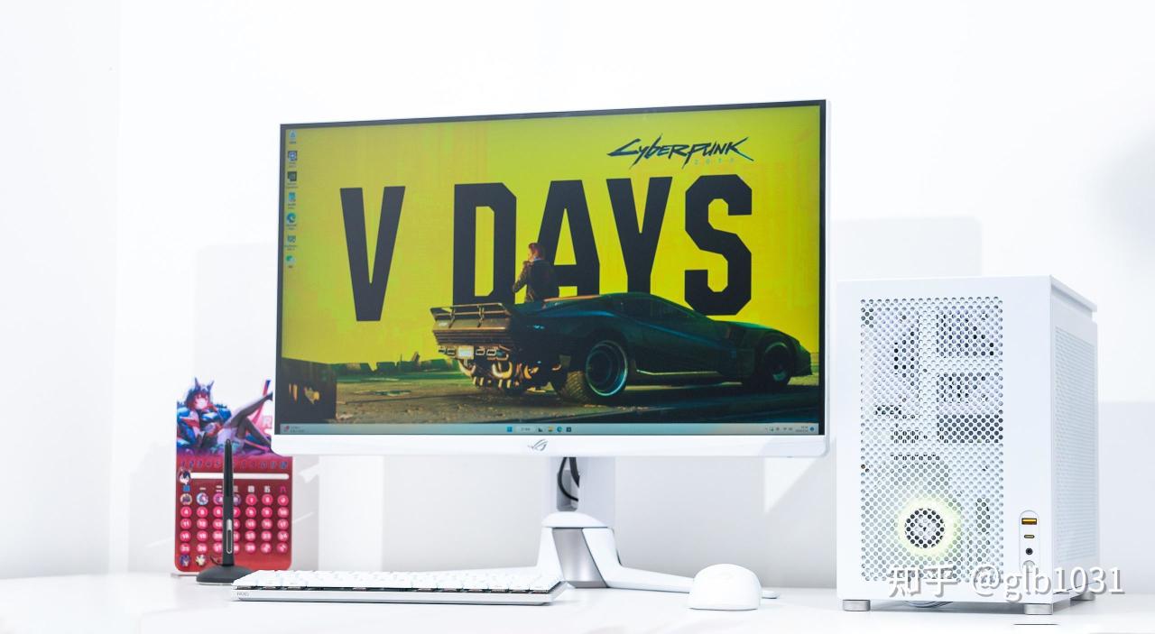 白色整机放在白色的桌面上也是非常的和谐,显示器我用的是我之前的华硕ROG PG27UQR-W 4K 电竞显示器。当然如果整体预算不高,也可以根据预算来选择。华硕TUF 系列的电竞小金刚VG27AQL3A-W 也会是2K 显示器中不错的选择。