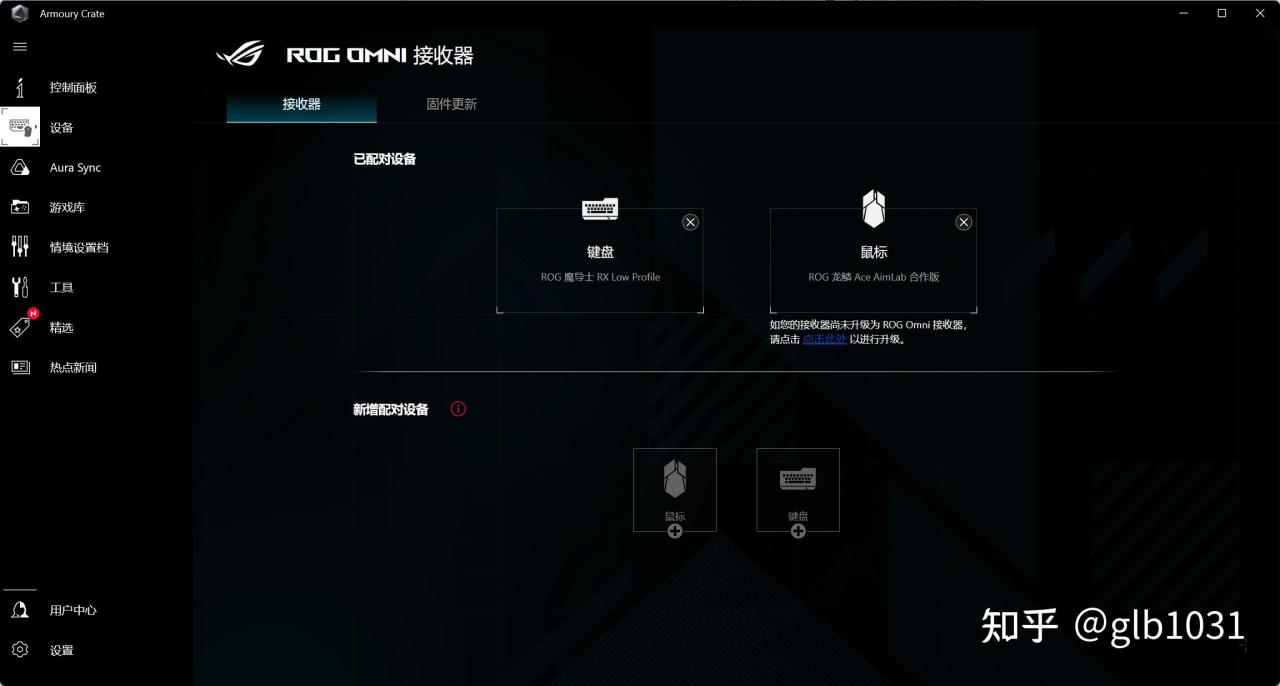 具体配置上可以在华硕奥创软件上进行设置,打开奥创打开设备中点击选择ROG Omni 接收器就可以对连接设备进行设置。配对方式没有难度,只是一个ROG Omni 接收器只可以配对一组键盘与鼠标。
