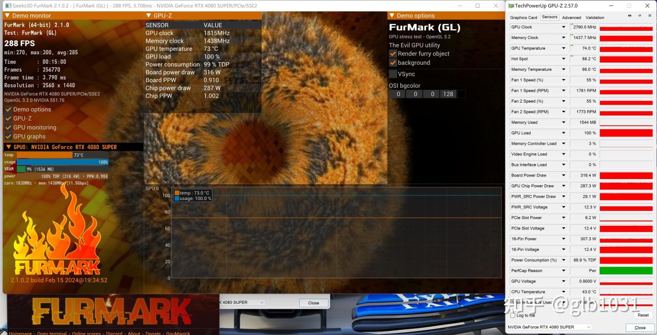 FurMark 显卡压力测试下,FurMark 软件版本也有升级,界面内可以直接查看压力下显卡状态。索泰RTX4080 SUPER 月白显卡温度73℃,显卡功耗316W。