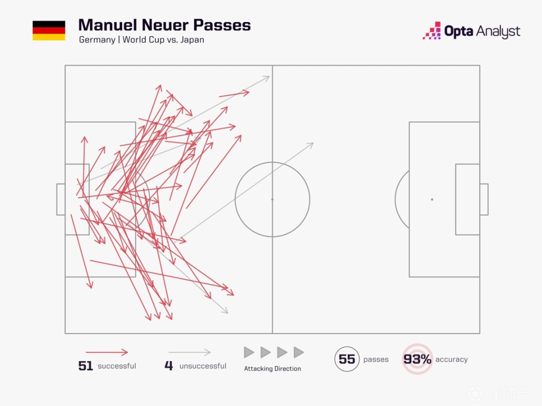 本场比赛诺伊尔一共送出55次传球,51次成功,传球成功率为93%。