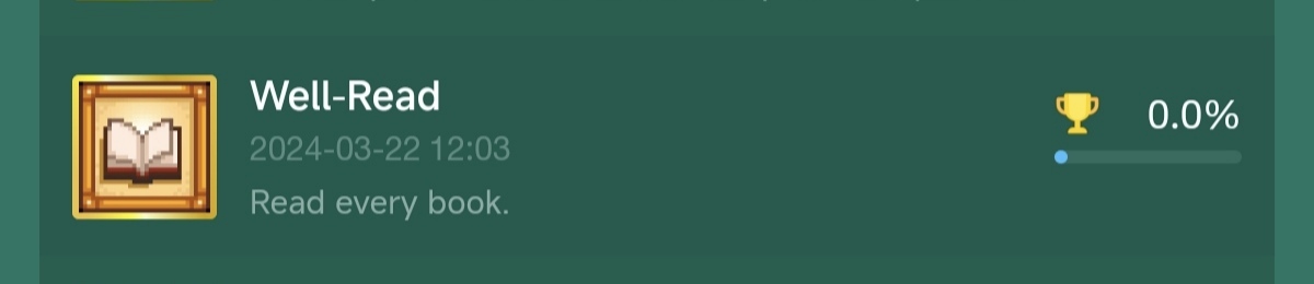 這個成就達成起來也沒有什麼難度,主要就是費時,技能書的獲取方式本人目前已知的有打怪,釣魚,做任務,書店。不過達成這個任務最方便的還是去刷書店,就是費點時間,沒有注意點