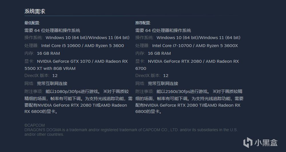 根据官方描述,游戏的最低配置为 Intel Core i5 10600 / AMD Ryzen 5 3600搭配NVIDIA GeForce GTX 1070 / AMD Radeon RX 5500 XT 8GB ,而推荐配置为Intel Core i7-10700 / AMD Ryzen 5 3600X搭配NVIDIA GeForce RTX 2080 / AMD Radeon RX 6700。