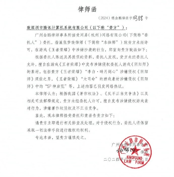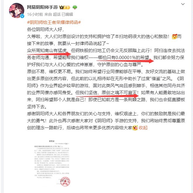 3月22日,《阴阳师手游》再次发起进攻,玩家们支持原创设计和拥护的热情给予阴阳师官方很大的信心和鼓励,一则律师函寄给《王者荣耀》。面对南山猛虎,怕只有0.00001%的希望,《阴阳师手游》也要与《王者荣耀》战斗到底。