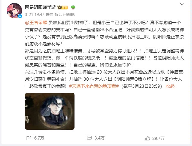 不过腾讯的《王者荣耀》在国内MOBA手游中堪称无敌,但网易旗下《阴阳师手游》热度也不低,更是敢于对其发出挑战。从21号开始,《阴阳师手游》就开始diss《王者荣耀》,具体内容太多,直接看图。省流总结:《王者荣耀》新英雄大司命的形象涉嫌抄袭《阴阳师》中的神启荒。