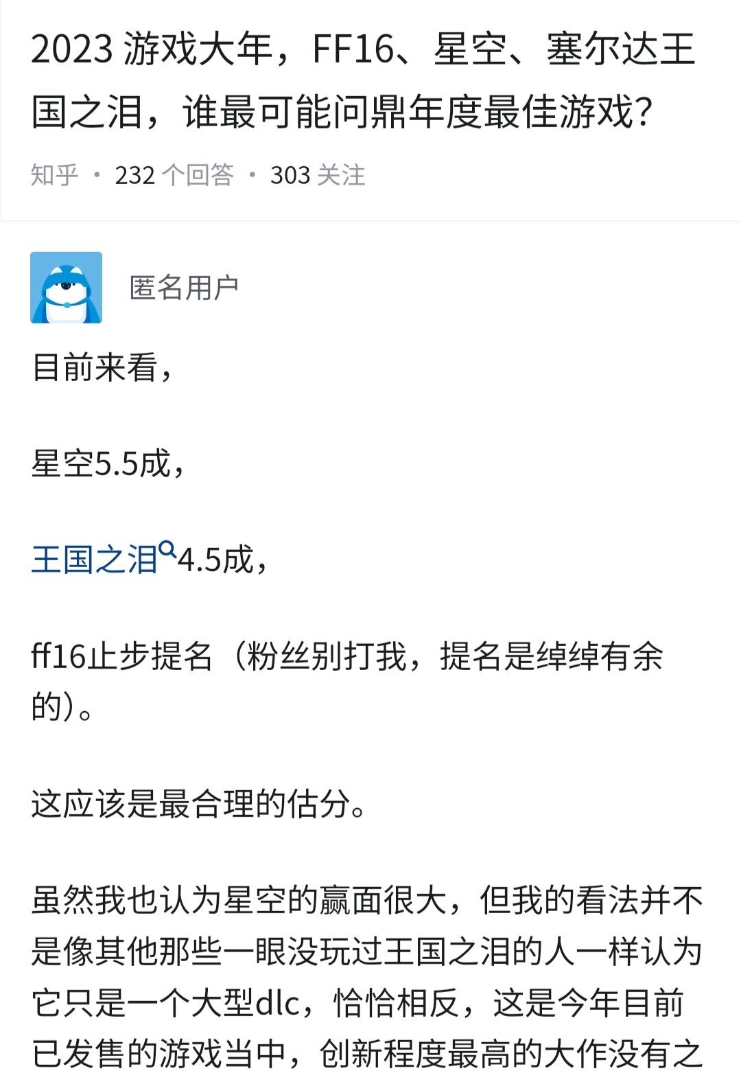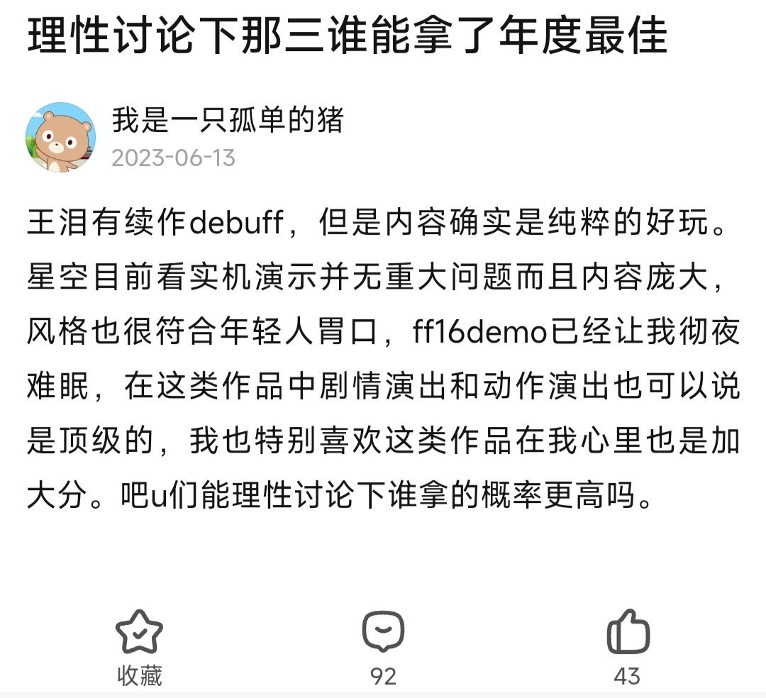 大家的目光仅在星空,ff16,王国之泪这御三家的游戏上,后来的结果大家也知道了,所以切忌半场开香槟,有可能今年goty还在某个小角落呢。