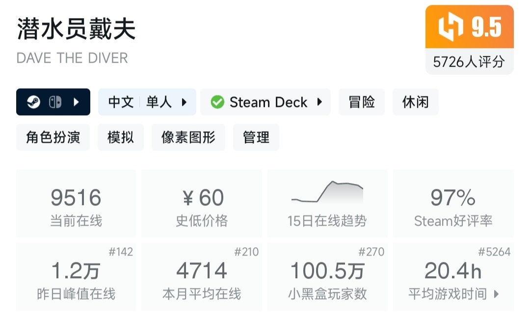 而那个做dnf和洛奇的NEXON,也出了潜水员戴夫这么一款精品游戏,在steam甚至拥有97%的好评!去年tga也提名了最佳独立游戏。