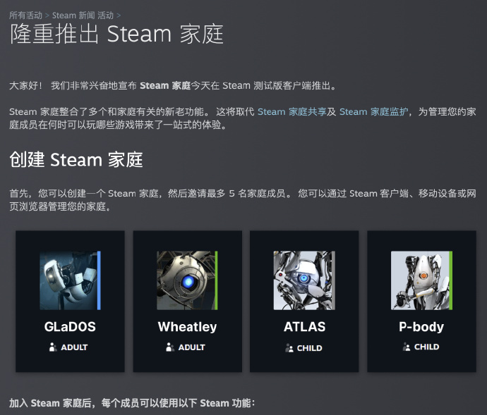 V社近日宣布将推出全新的“Steam 家庭”Beta 测试功能,以此整合多个和家庭有关的新老功能,并将取代“Steam 家庭共享”及“Steam 家庭监护” 功能。