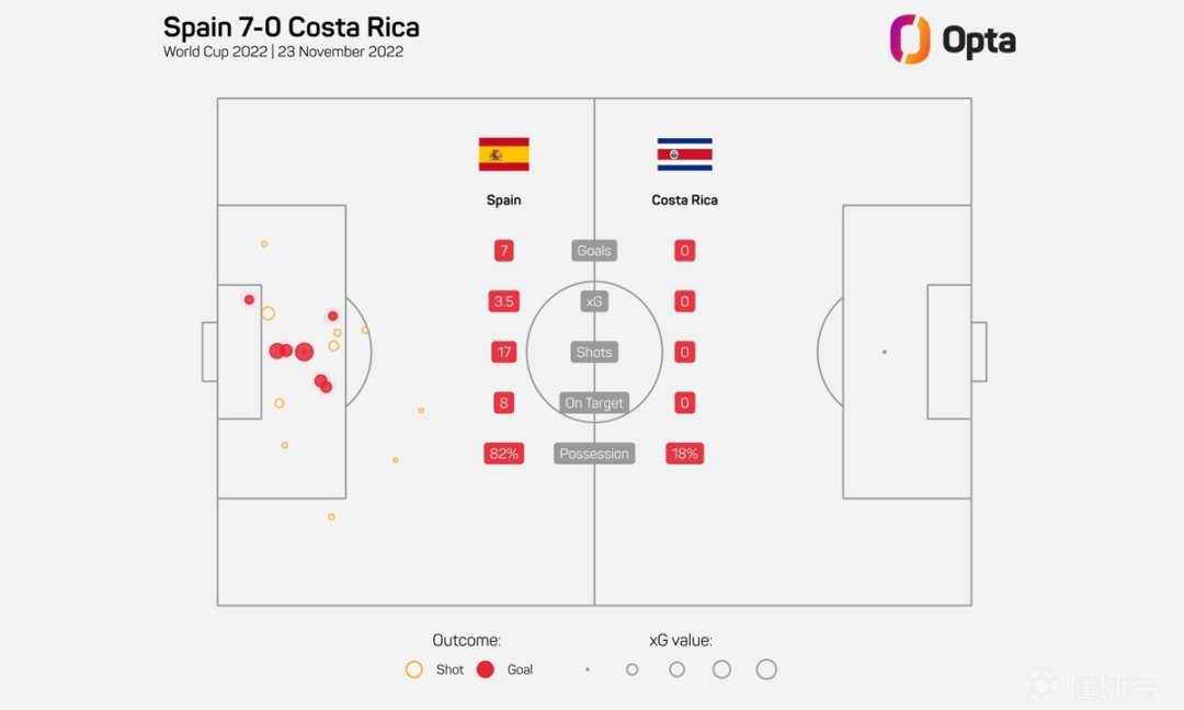 在与哥斯达黎加的比赛中,西班牙8次射正打入7球,创造有统计以来世界杯纪录。