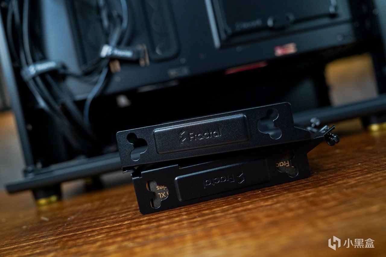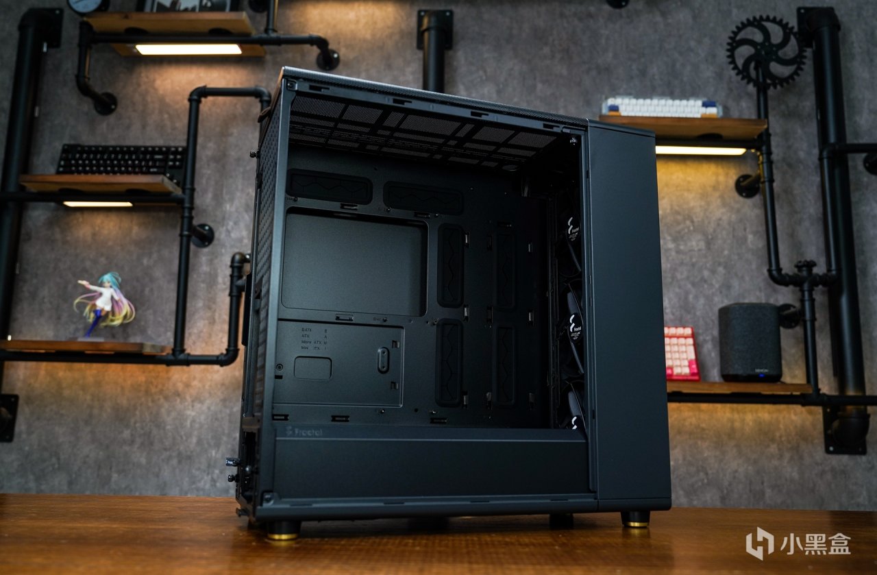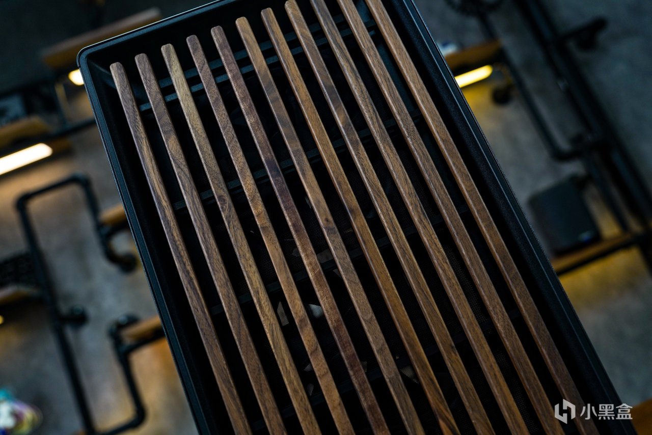這款機箱也是和其他分形工藝機箱採用前進風,上置或者下置出風的傳統對流風道佈局。輕拉前面板下方凹槽處機關即可拆卸前面實木裝飾面板。前面板內部預裝 3 顆 Aspect 140mm PWM 靜音風扇,風扇抽芯處爲分形工藝英文 Logo。風扇素質很高,風量大又靜音,散熱能效還是不錯的所以這裏就不替換成其他款式風扇了。前置的胡桃木實木裝飾可以通過木條預留間隙來進行通風散熱,對比普通的MESH或者條紋裝飾的面板,實木面板也是非常符合這次的低奢復古風格。