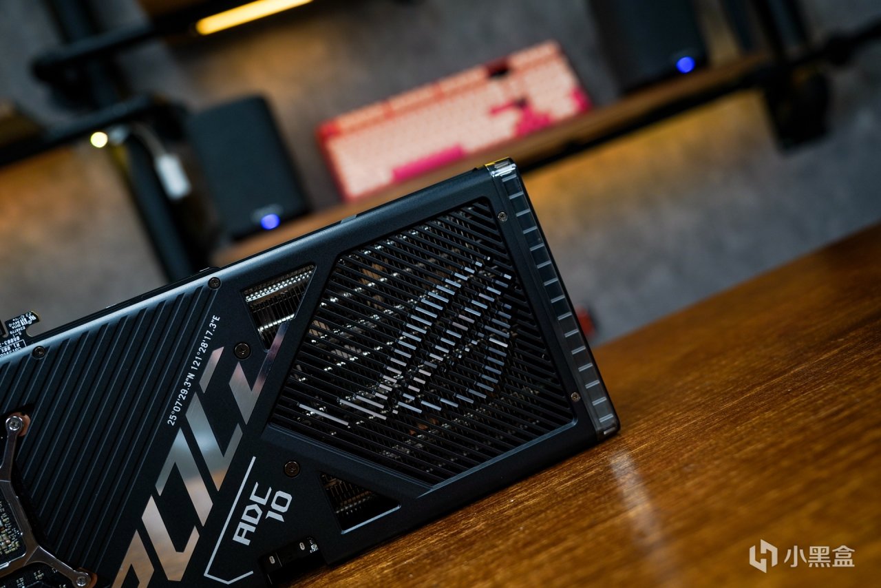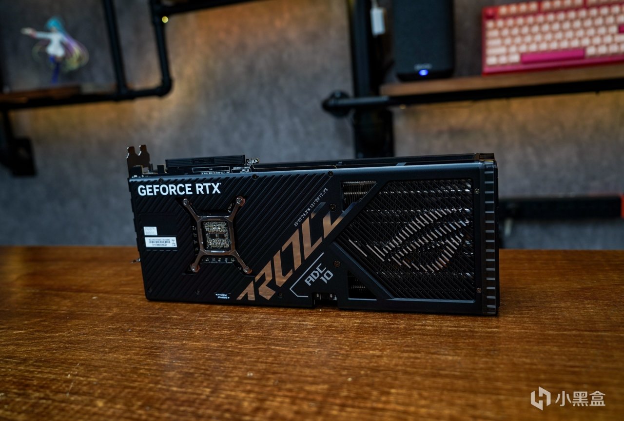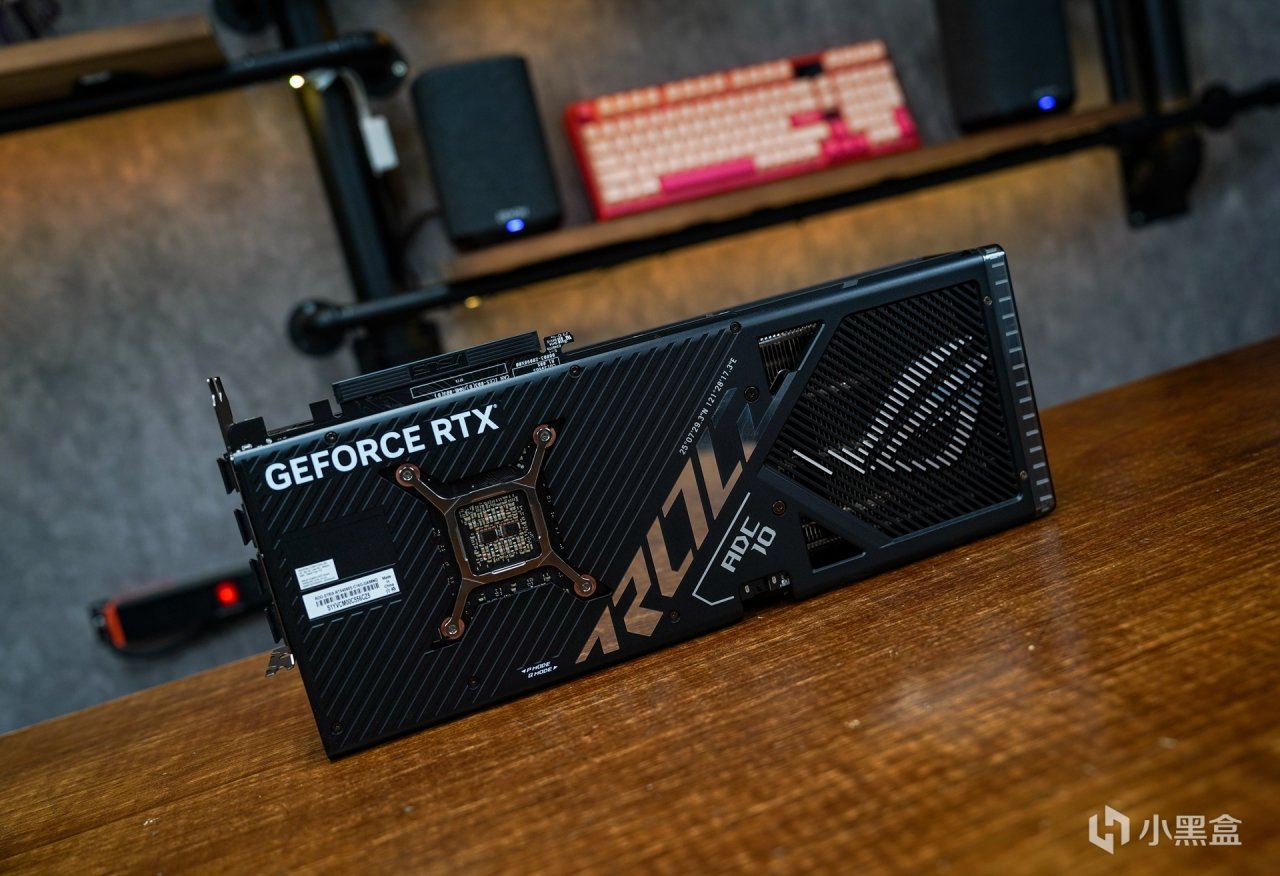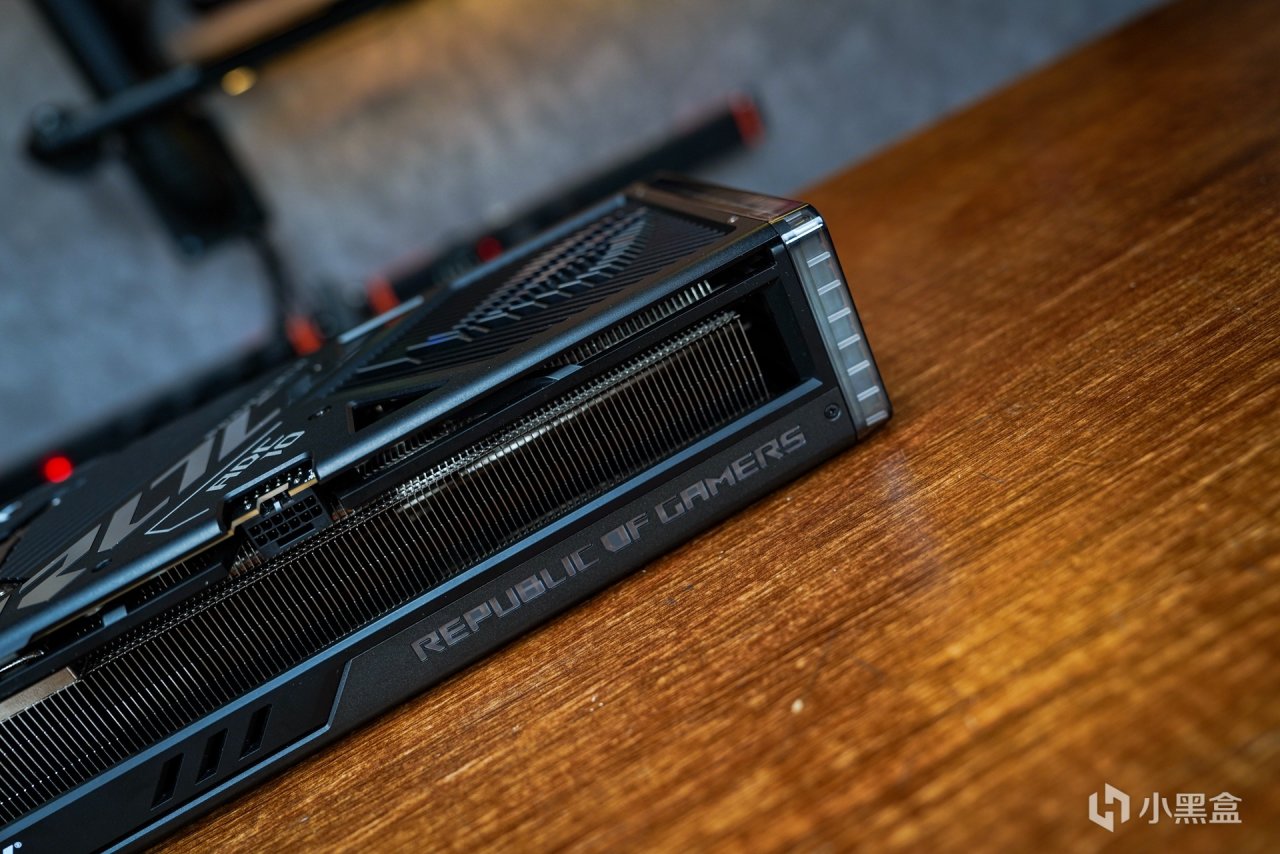 金屬背板的設計和正面風扇罩一樣,帶有 ROG 元素修飾,黑白配色的文字排版更有設計感,另輔助斜切線條的元素。鏤空出風口,採用斜線柵格樣式,輔以高光處理的信仰之眼點綴。真空腔均熱板具有銑削而成的凹槽,讓散熱導管下嵌而不被壓平,使熱源更有效傳遞到鰭片。相較於傳統的熱導板和熱導管組合,這種強大的組合在承受 500W 散熱負載時,可讓 GPU 溫度降低多達 5℃。