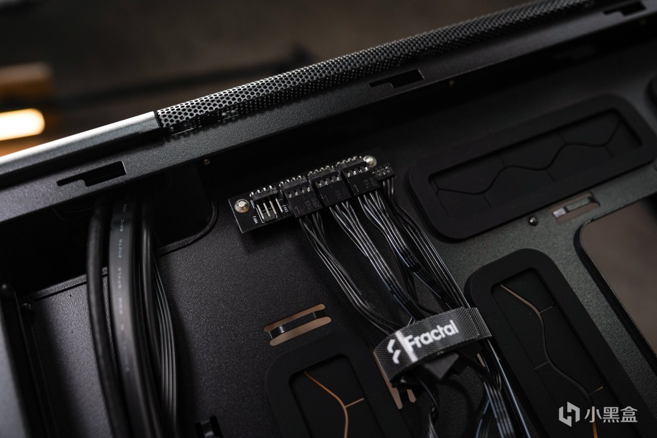 背面的設計基本和North是一樣的,背線空間充裕也足夠理線使用。並且在左上角邊設置了 1 個一分四風扇 4Pin 集線器,三個自帶的14CM風扇的接口均有1分二的串口可以串聯多組散熱風扇。ATX 電源安裝位兼容:安裝 1 個 3.5 寸硬盤支架,則電源長度最大支持 295mm,若安裝 2 個 3.5 寸硬盤支架,則電源長度最大支持 175mm。