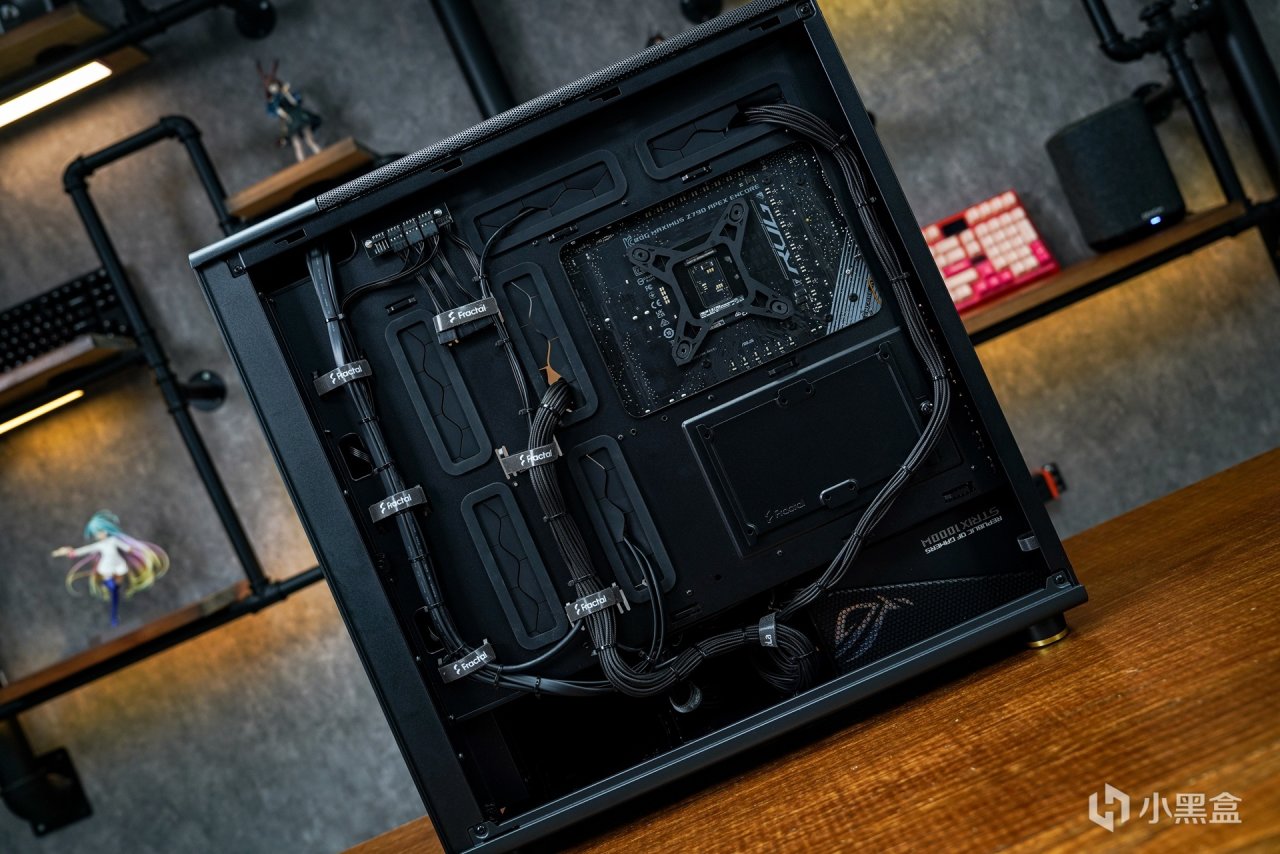 從整個背線整理可以看到,這款機箱在背線上採用左中右三組分邊錨點設計,左側和中間均有固定的魔術貼來進行線材固定,就算不是定製模組線材,使用原裝線材也能整理出非常工整的背線。唯一不足的就是華碩雷鷹電源的CPU線材依然是比較偏短,在整理右邊線材時的整體長度也只能說勉強足夠,希望華碩可以改進下CPU線材的長度讓其更適合大型箱體的使用。