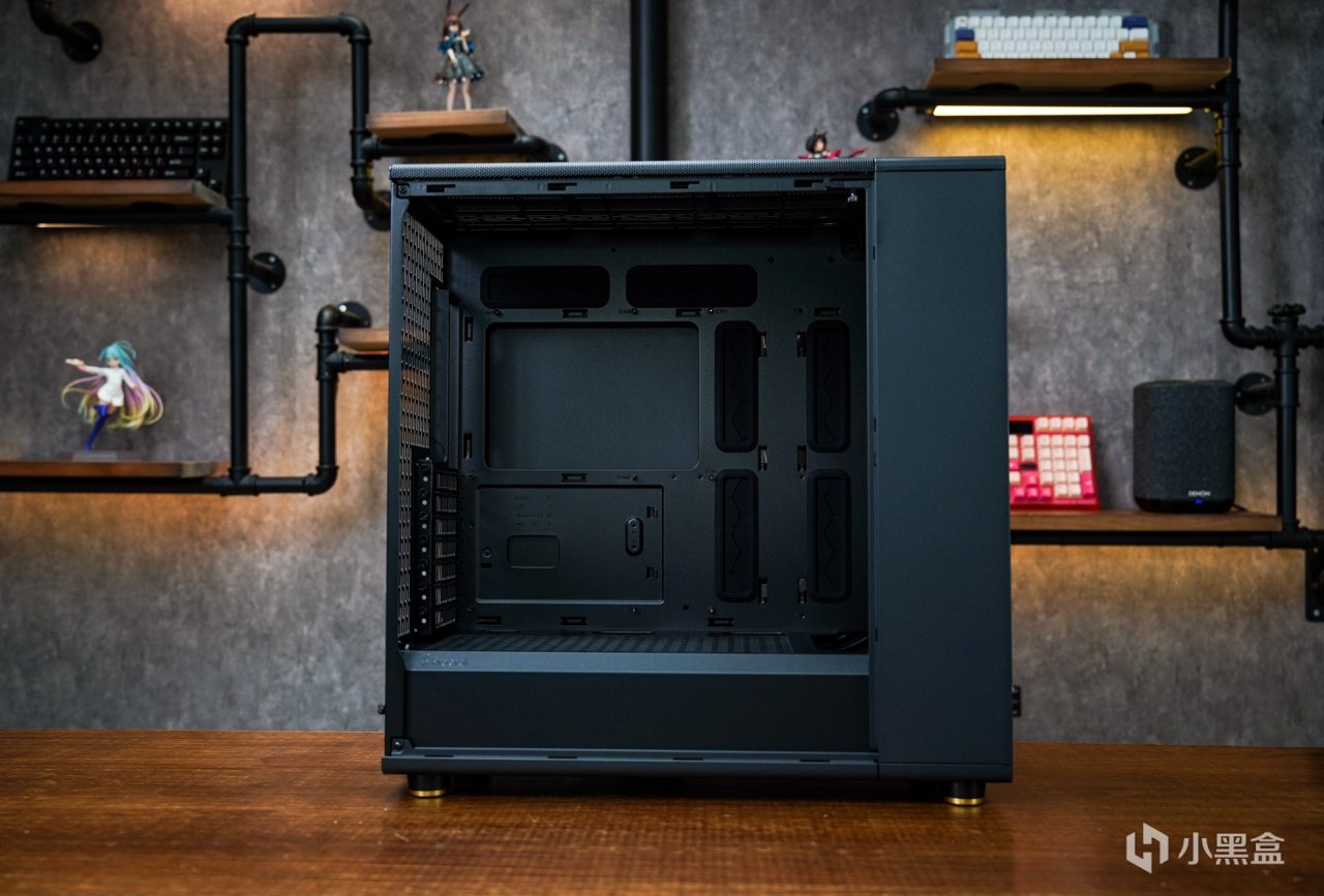 拆卸所有面板後,可以看到這款機箱在兼容性方面所支持的主板支持最大 E-ATX 主板(最大 330mm),對比North 來說這是個升級體積後的XL型號。讓內部空間從原來只兼容ATX主板擴容到可兼容E-ATX主板。