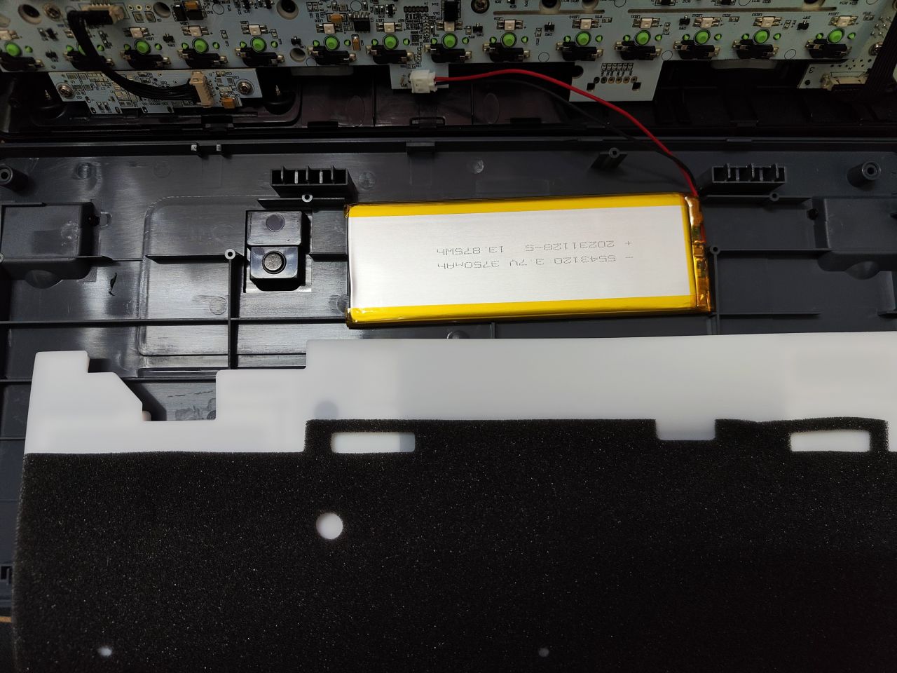 一块3750mah的电池被粘在底部,上面是形状十分贴合的硅胶垫,硅胶垫上面还垫了一层消音棉,让键盘内部几乎不留一丝空腔。