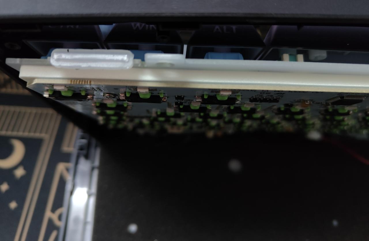 然后上面从上到下依次是PC定位板、poron夹心棉、ixpe轴下垫、pet膜、单键开槽的pcb,这个价位不仅把填充拉满,还对PCB做了单键开槽是让我感觉有点难以置信的。