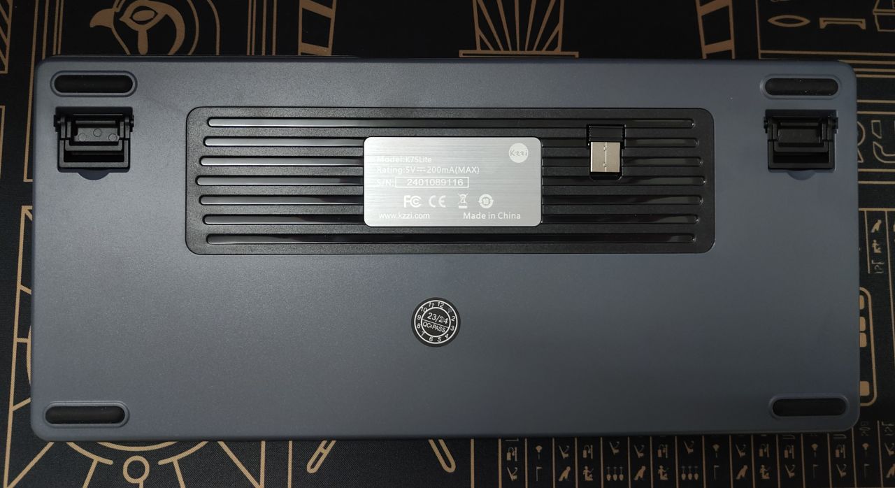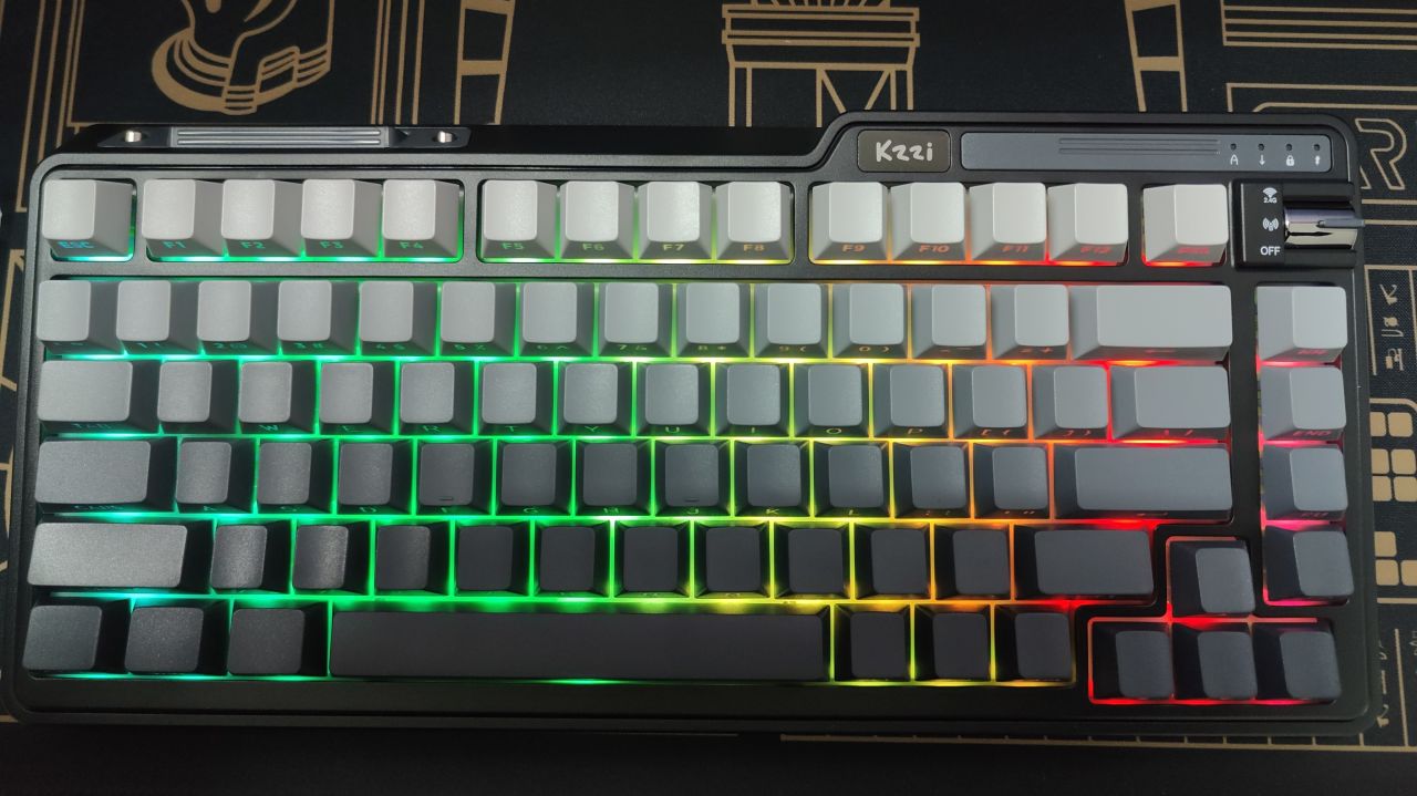 右上角的拨杆应该是正面最吸睛的地方,和别家的滑块不同,珂芝通过这个拨杆来调节键盘的连接方式,每次拨动都显得十分有仪式感。拨杆上方是大小写等指示灯,左边原来K75放电量显示屏的位置被阉割成了一个LOGO贴纸。