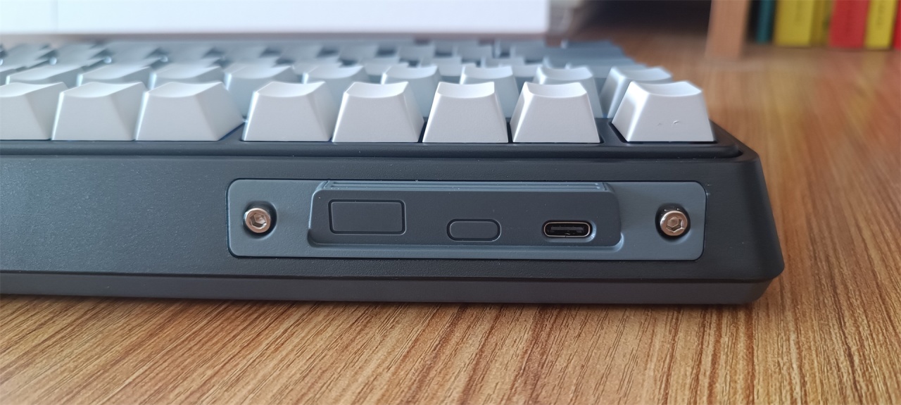 键盘右上方区域设计有一个三段式的拨片,可以随时切换2.4G无线、蓝牙和有线连接三种方式,拨动时还有种仪式感,个人非常喜欢。
