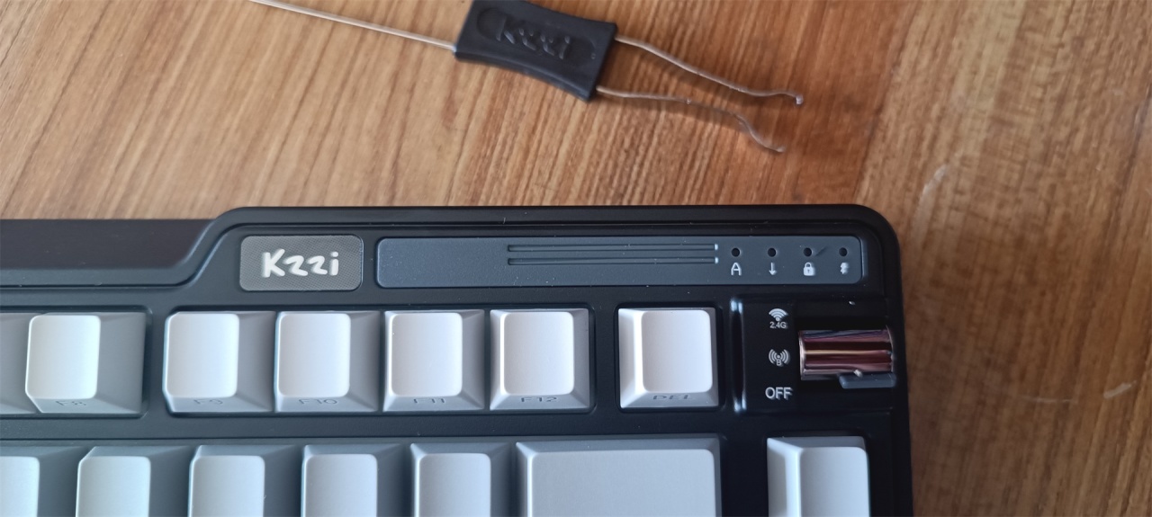 再往上是键盘的指示灯区域,指示灯左侧原本为电量显示屏,Lite版本则改为了珂芝的英文Logo。