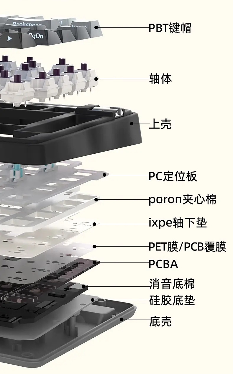 下面看看珂芝K75Lite的结构设计,本次继续采用了时下流行的Gasket结构,五层填充设计兼具了按压手感和降噪效果,回弹性和稳定性都有不错的反馈。