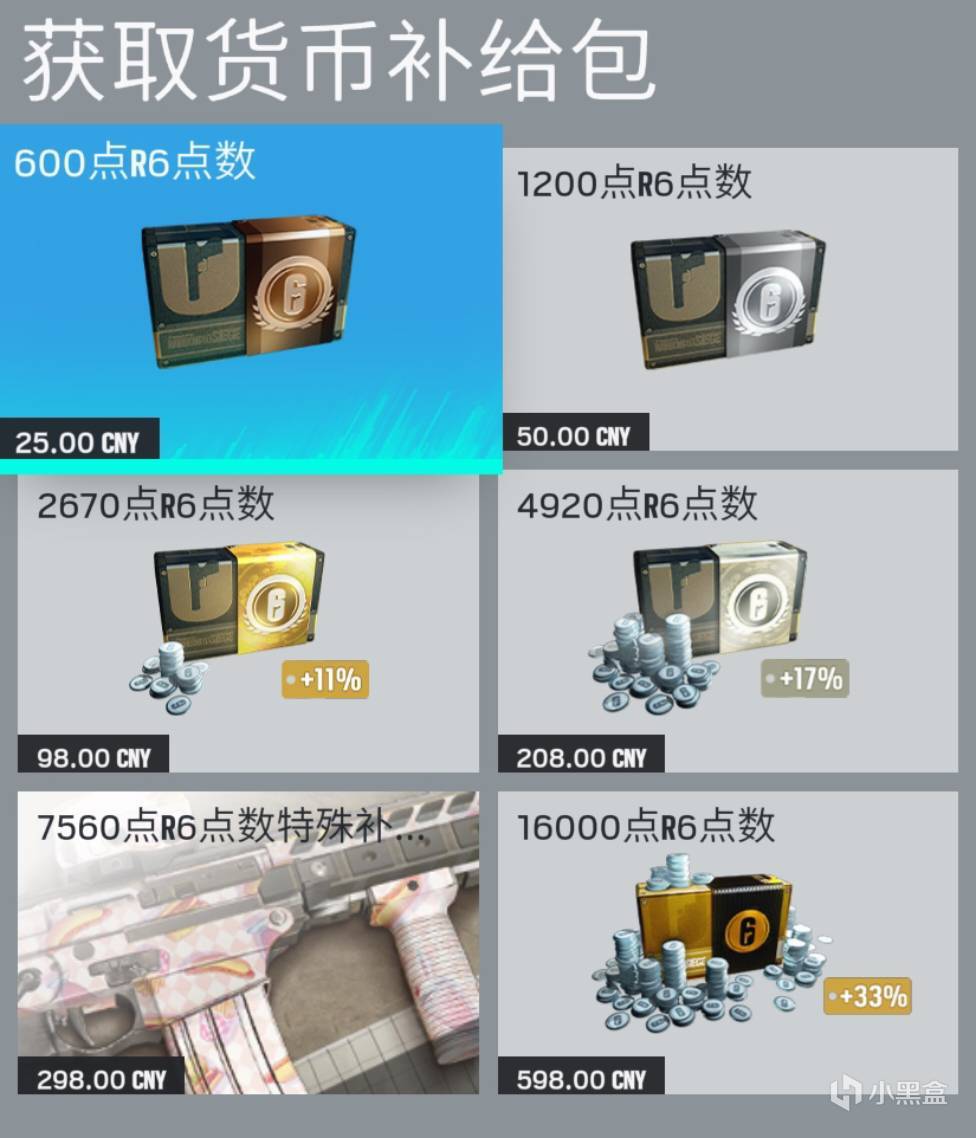 如果,想自己进行充值或是放心不下,也可以自己进行支付。首先,开机后先打开ubi平台,这时一定不要开加速,再使用小黑盒加速器加速steam商店/社区,在ubi中点击开始r6游戏,裸连进入游戏,进入游戏后,在游戏未彻底打开前敲击shift+f2,进入商城进行购买,之后会跳转steam,选择想要的r6点数即可。