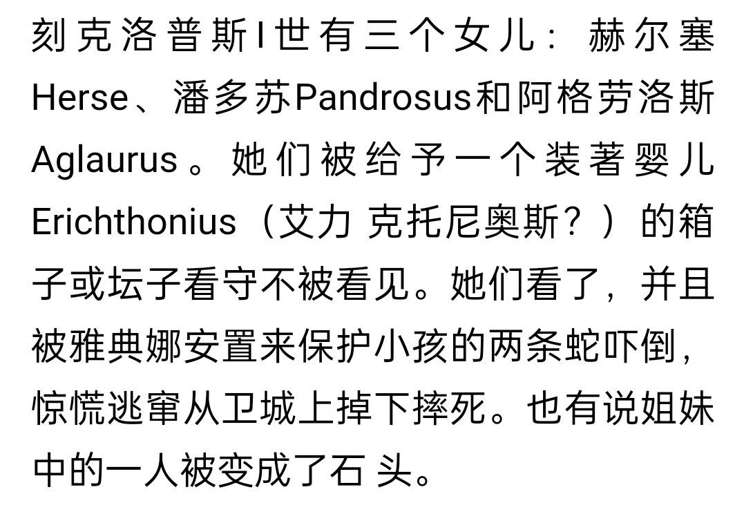 他的兩個女兒,一個被雅典娜安置來保護小孩的兩條蛇嚇倒,驚慌逃竄從衛城上掉下摔死。另外一人不知道是什麼原因被變成了石頭。