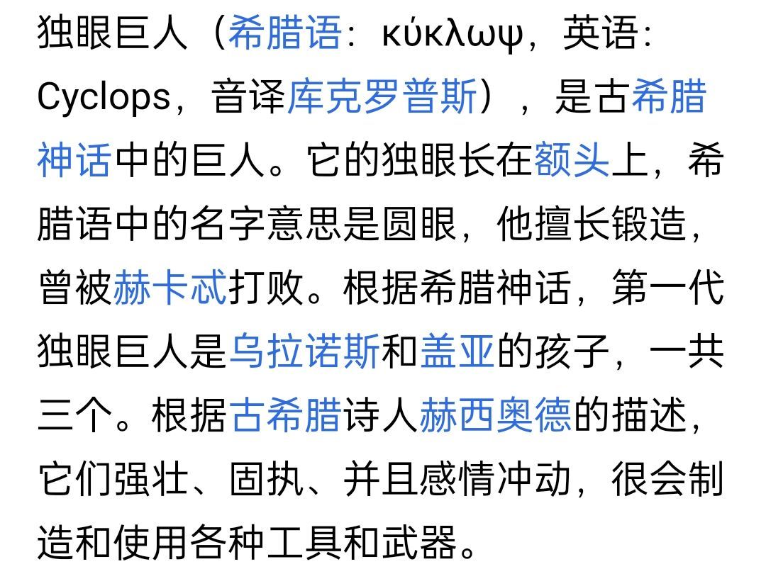 獨眼巨人是烏拉諾斯和蓋亞的孩子,他有着與生俱來的打造天賦,他曾經與赫卡忒交戰,並且被打敗。