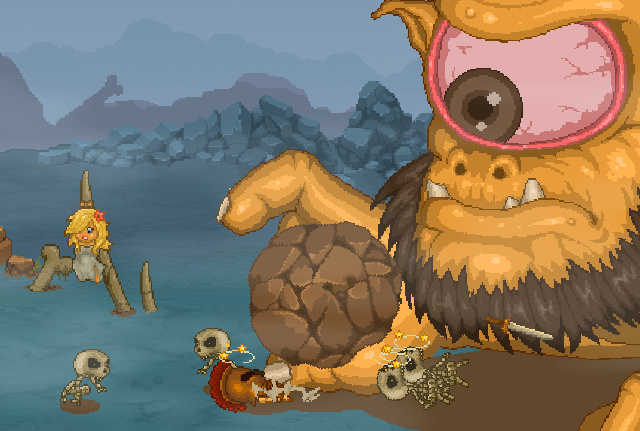 受傷的獨眼巨人憤怒的咆哮,他被囚禁在了這座山中無法動彈,只能以右手做簡單的揮擊,然而默契雙刃戰士很快就抓住了獨眼巨人的破綻,再次擊暈了他。