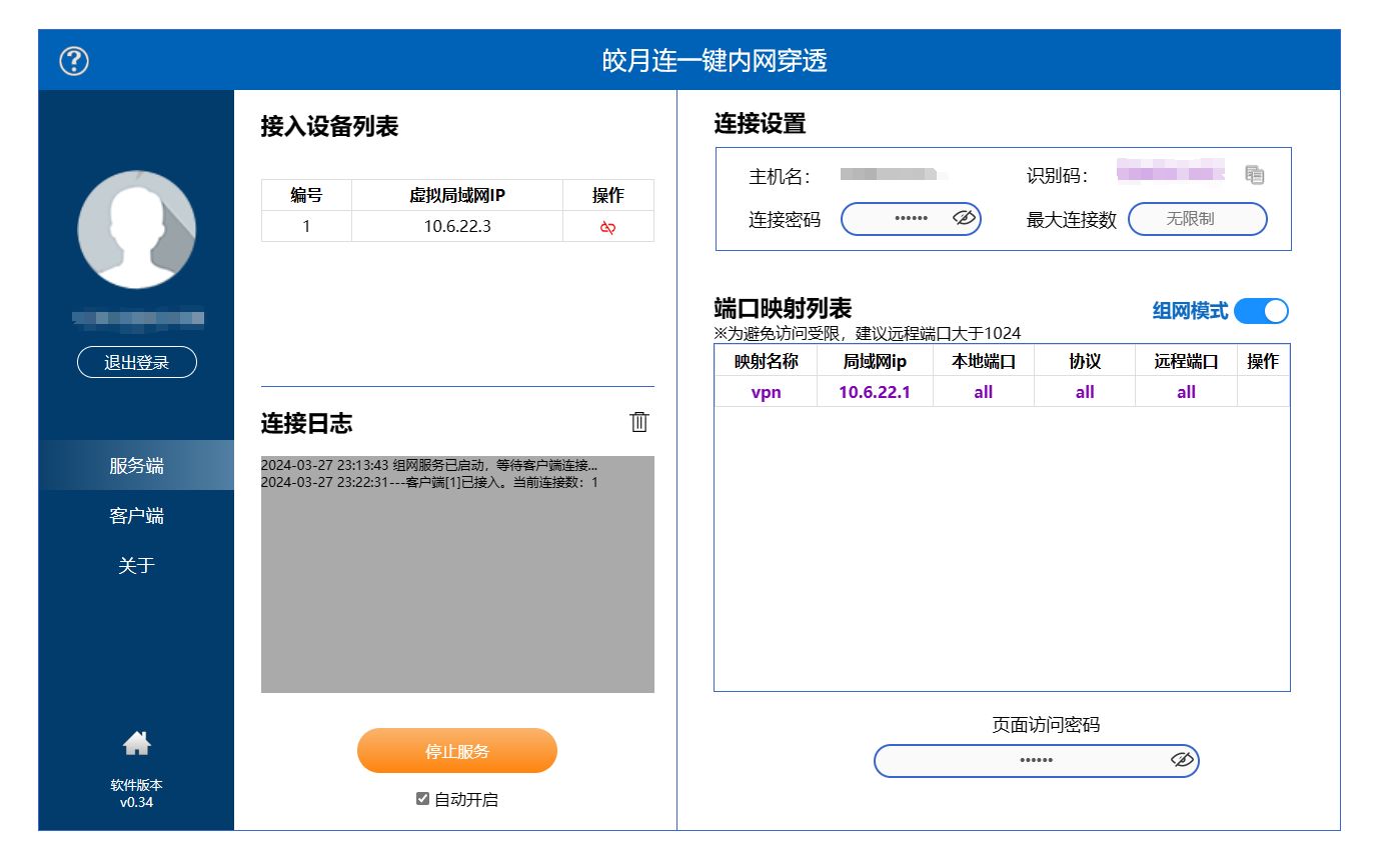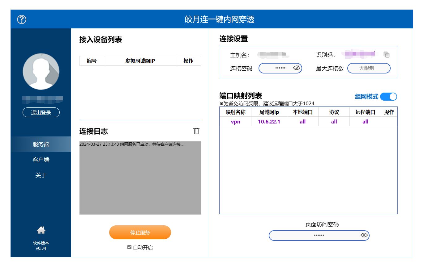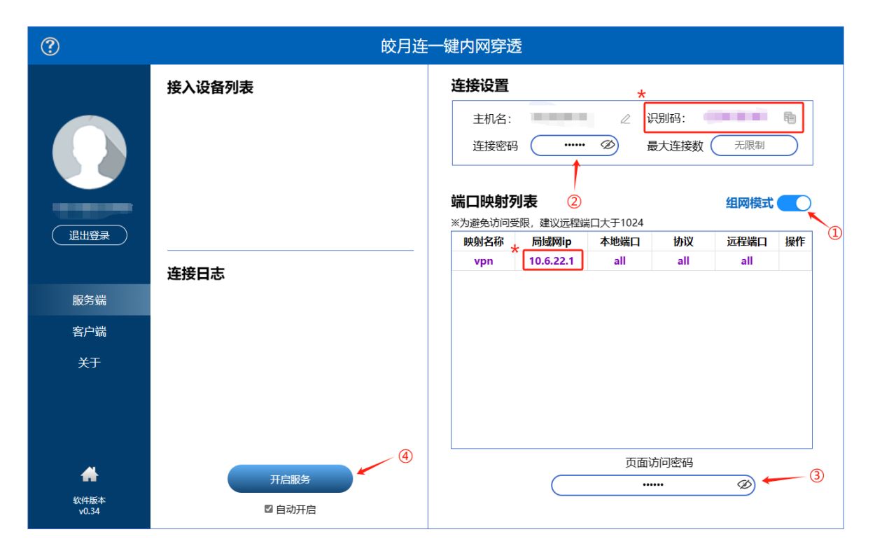 PC端的皎月連登錄成功後,進入皎月連WebUI的主界面,依次打開組網模式,設置連接密碼,設置頁面訪問密碼,記住識別碼和局域網IP,最後點擊開啓服務,期間會彈出「創建虛擬網卡」彈窗,加載完成後若處於圖示界面,則皎月連PC端配置完成