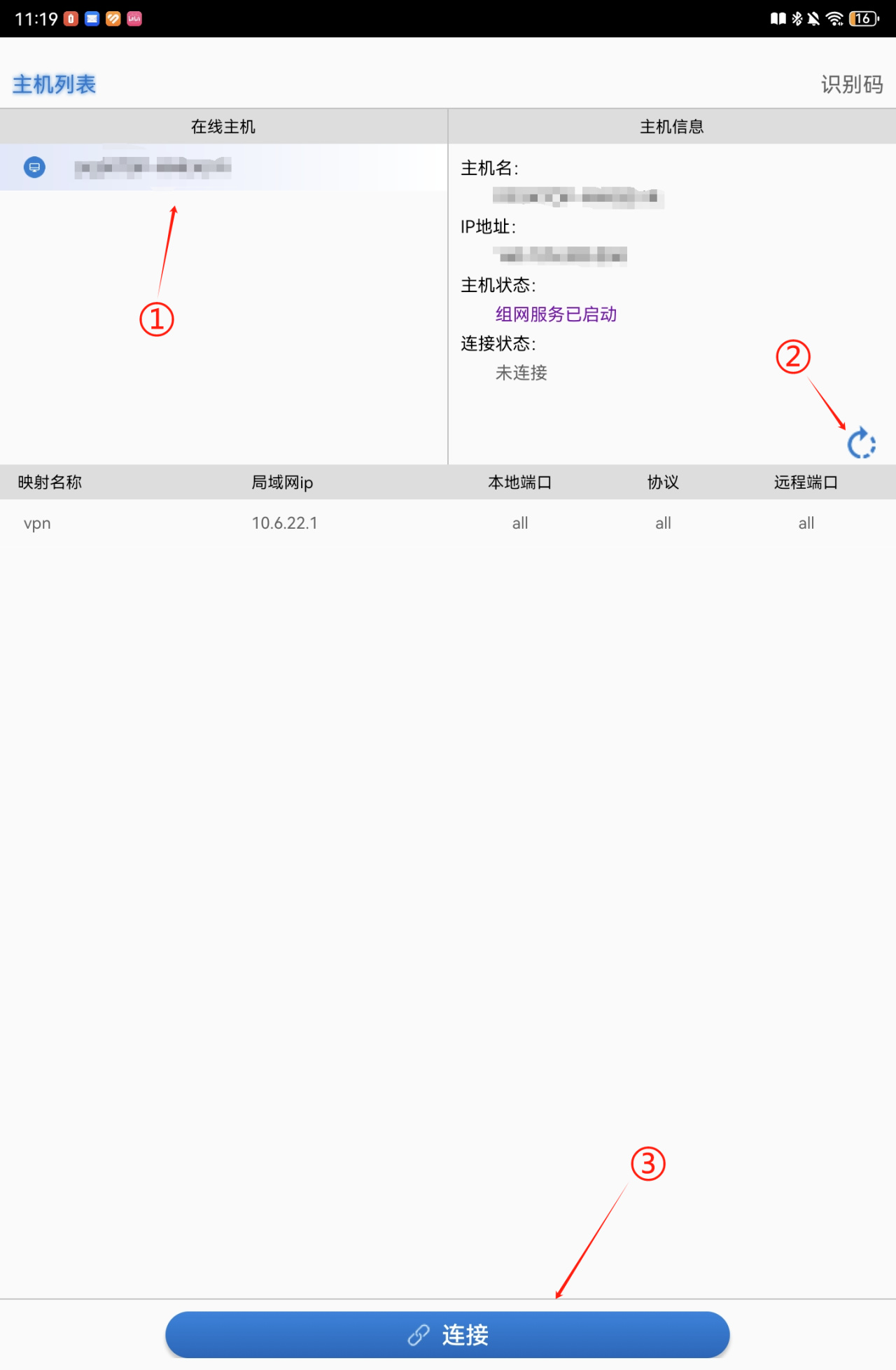 在移動端登錄後在「在線主機」中選擇所需的主機,然後在「主機信息」中刷新🔄一下,最後點擊連接