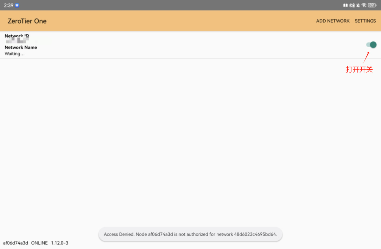在移動端zerotier中點擊「add network」進入設置界面,輸入複製得到的虛擬局域網ID,不用做過多的設置,點擊「add」完成配置,打開網絡連接開關