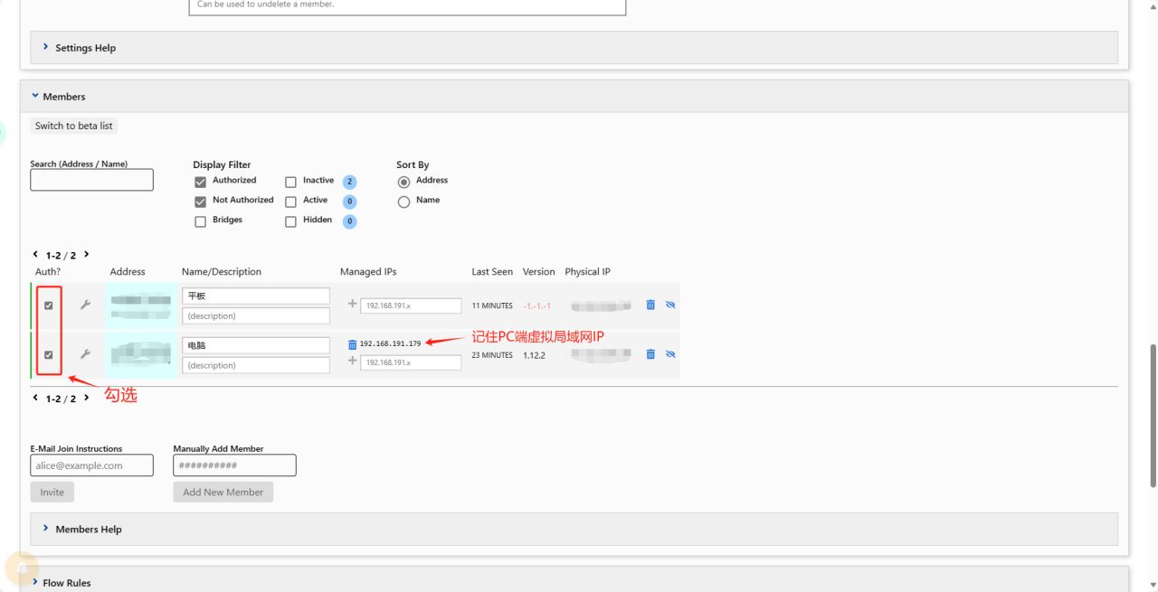 完成上述步驟後,回到PC端界面,往下翻,找到「member」選項,勾選剛剛添加的設備並命名,方便管理設備,此時虛擬局域網便搭建成功,記住虛擬局域網的IP