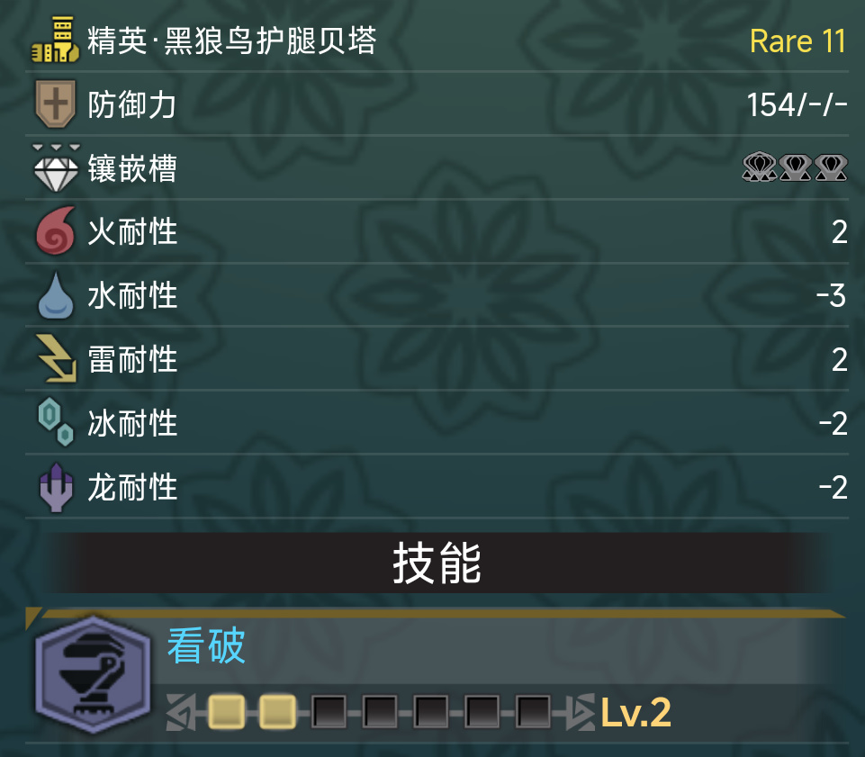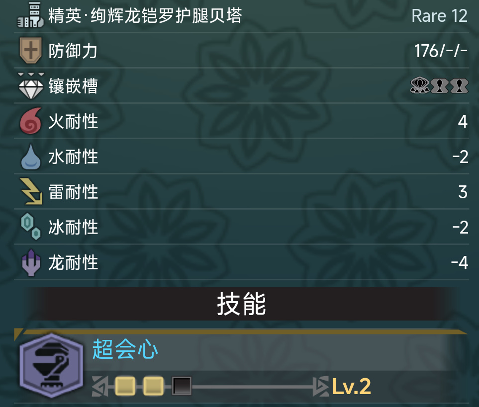 大馬士革胸兩級集中,孔位優秀,是大劍後期必須要帶的裝備。黑狼鳥腿和絢輝龍腿相仿,雖然黑狼鳥腿+兩級超會心=絢輝龍腿+兩級看破,但是看破好出不少而超會心難出,因此絢輝龍腿的地位非常高,即便你穿上畢業的黑龍套了,在大師等級100拿到更優秀的雪崩伽馬腿之前爲了超會心也要穿絢輝龍腿。