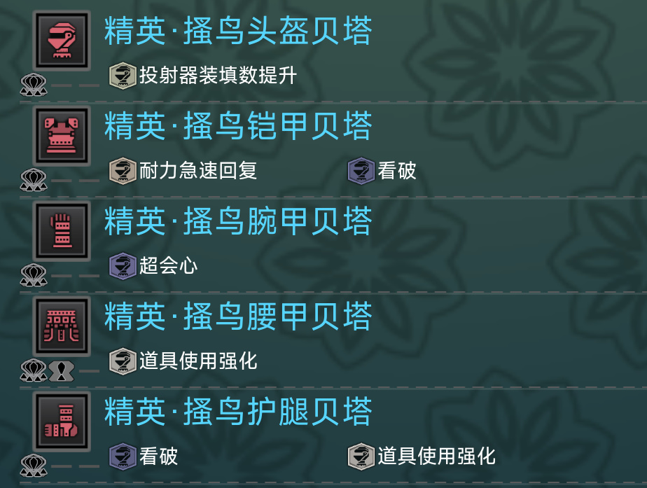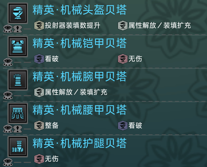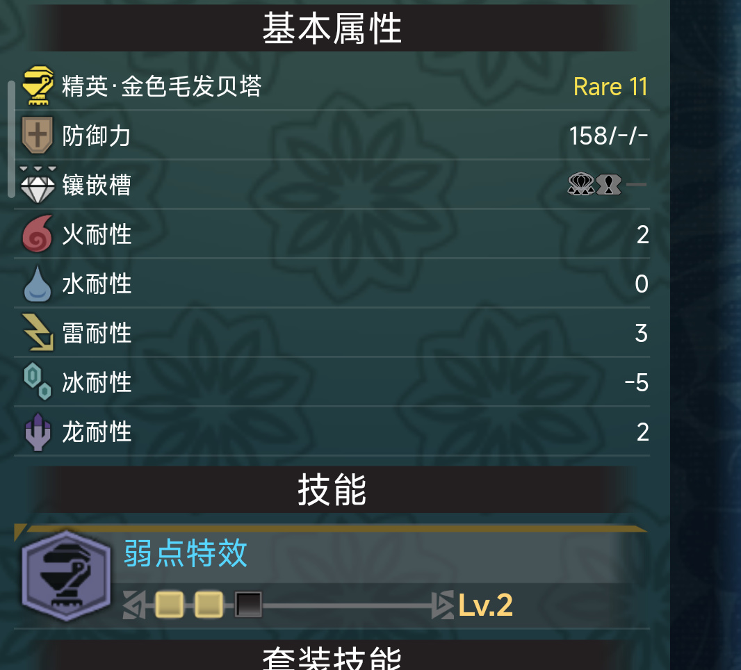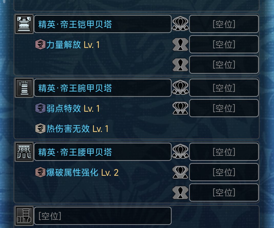 巨甲蟲頭腰都有一級弱點特效,孔位也不錯。搔鳥則是提供看破和超會心,搔鳥手經常用來和阿斯特拉胸一起組成3級超會心。機械胸阿爾法自帶3級看破,是非常優秀的散件。而機械頭手可以組成3級屬性解放,完美適配斬斧開荒需要把眠斬斧屬性解放的需求。而且機械二件套效果“太古的神祕”還能讓積累的異常值變多,更容易打出眠異常。機械說是斬斧的專屬聖遺物也不爲過。