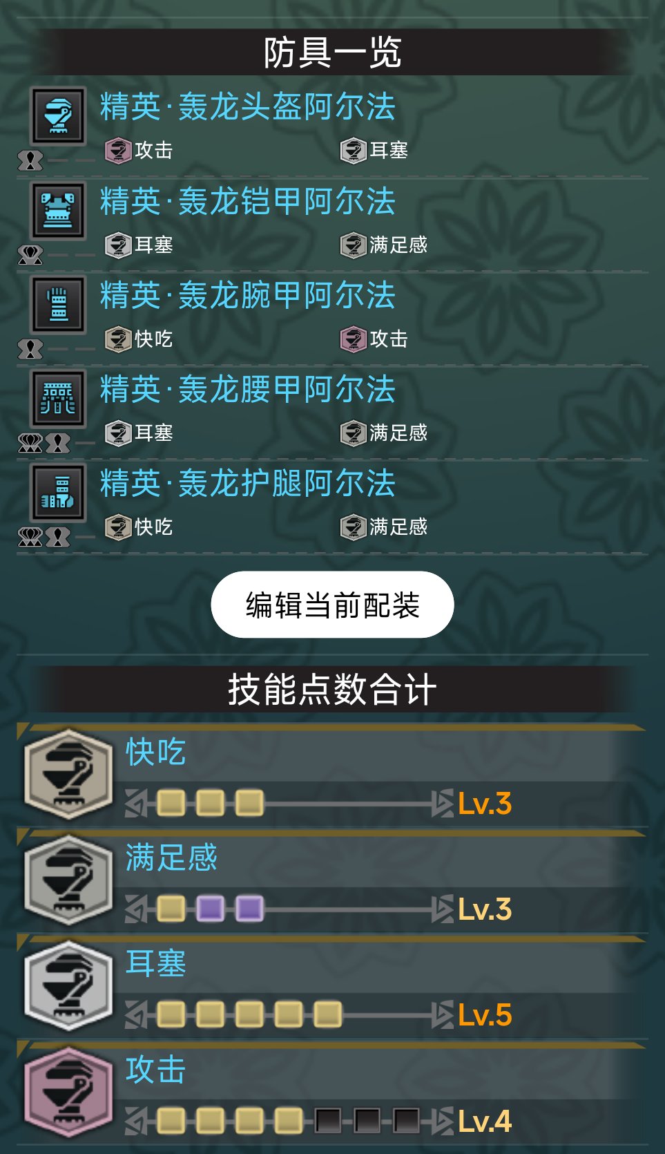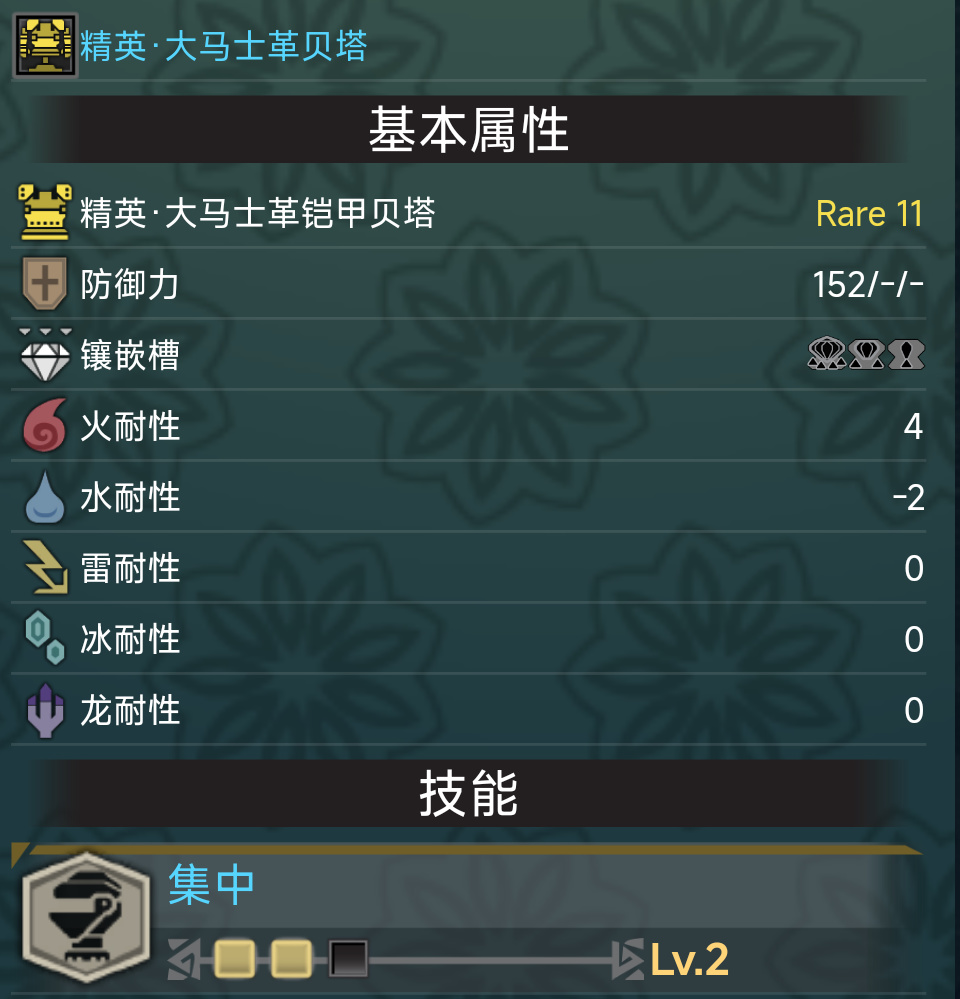 怪獵配裝主要是爲了技能,最終的技能效果由裝備自帶技能和珠子提供的技能共同成就,例如煌黑龍阿爾法手(自帶3級攻擊),一顆攻擊珠2【4】,兩顆攻擊珠【1】,他們的攻擊一共加起來是7,然後我們就能在自己目前的面板裏看到攻擊7。(僅舉例子,攻擊這個垃圾技能非常不值得出)因此最終挑選裝備的標準就是他攜帶的技能和他自帶的孔位,孔位決定能塞進去多少珠子。