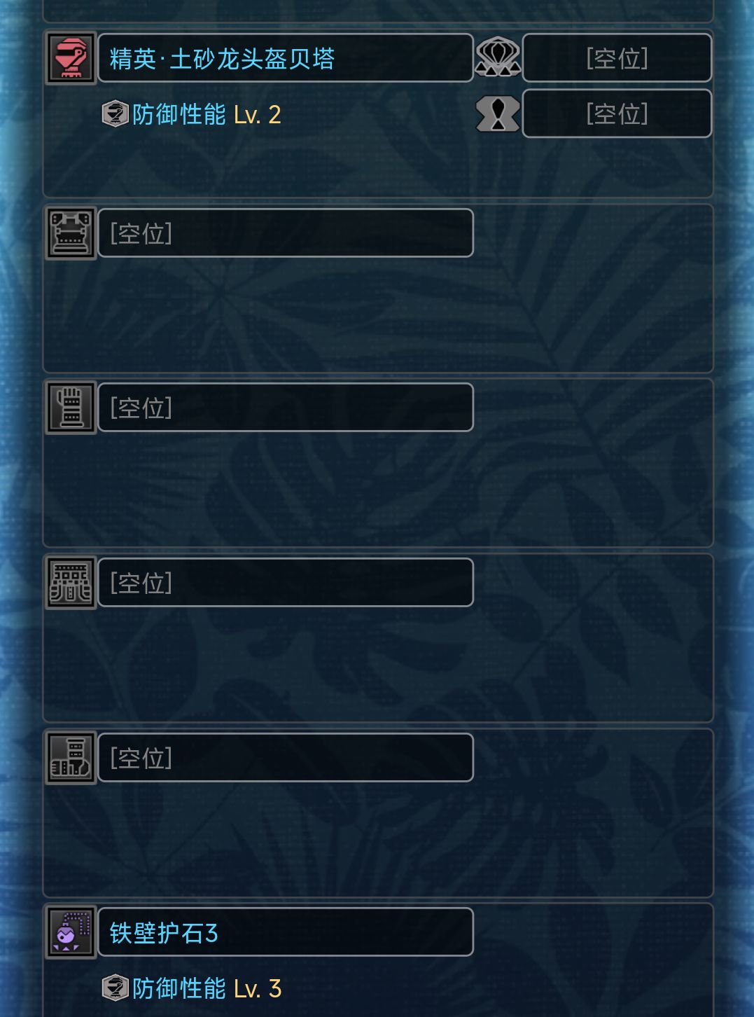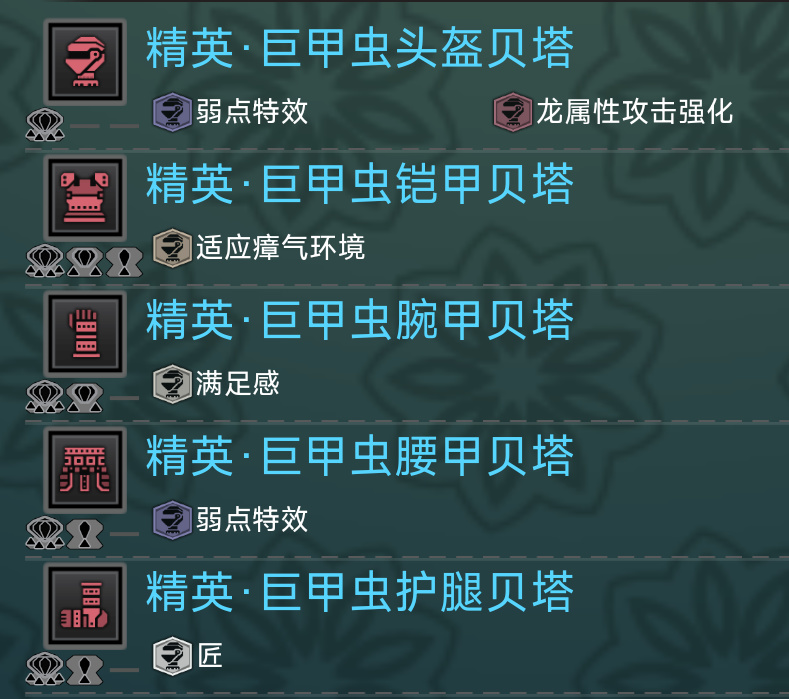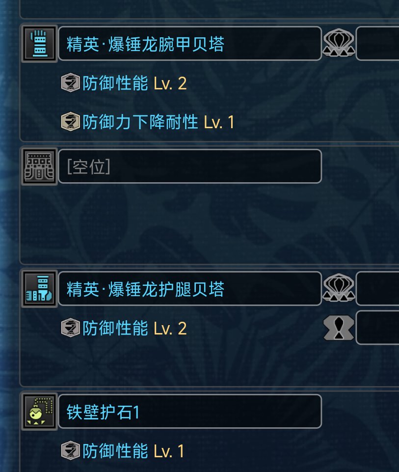 長槍等帶盾武器在這一階段就可以考慮爆錘龍2件套了,搭配護石或者一個鐵壁珠出防禦性能5和防禦強化。然後剩下三件就用自帶技能很強的散件。