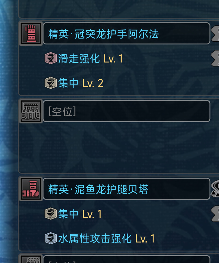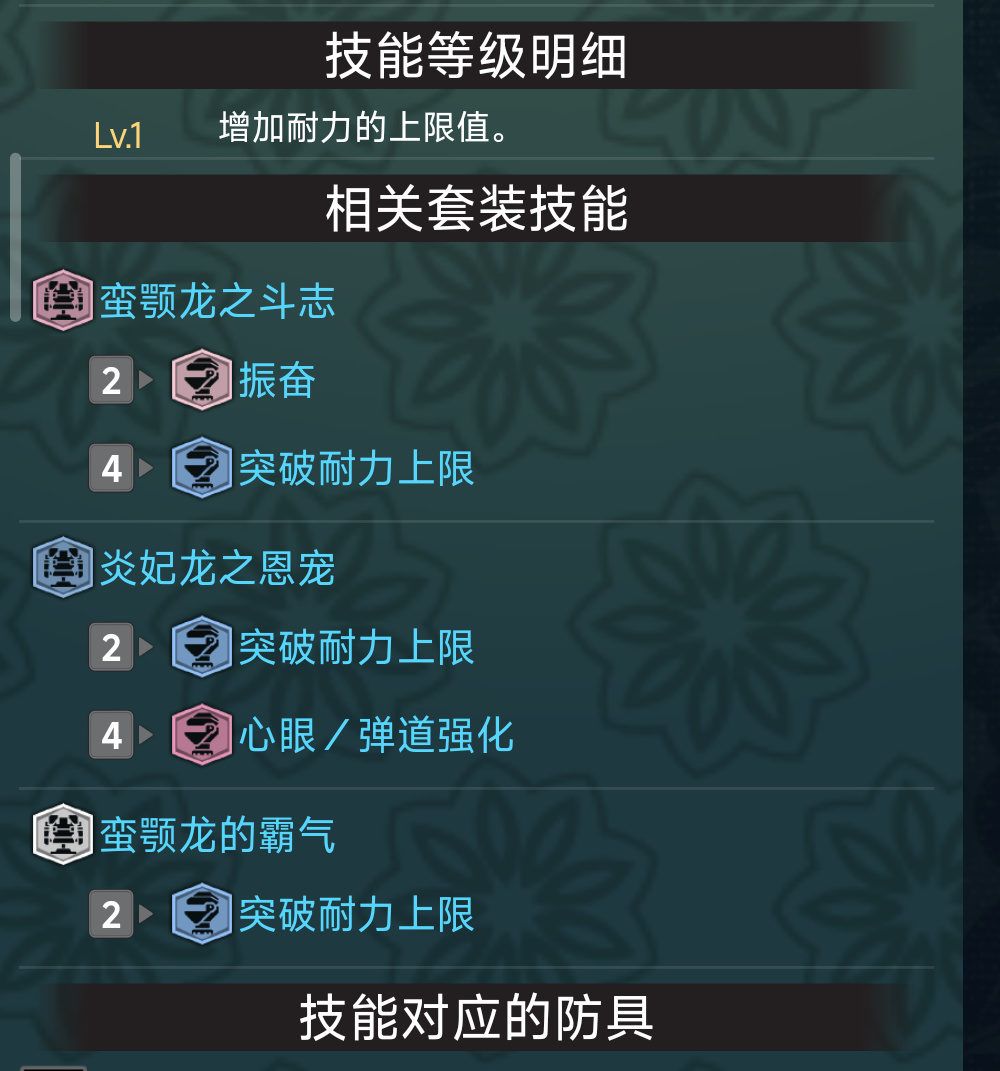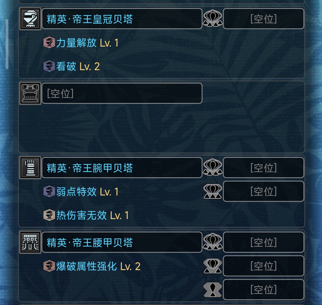 最後,除去必須考慮的看破弱特超心外,武器自身所需要的技能也是不同的,例如大劍需要集中3,雙刀最好有雷顎龍2件套的突破耐力上限,斬斧搭配開荒用的牙龍劍斧要出屬性解放,而長槍則需要防禦性能和防禦強化。