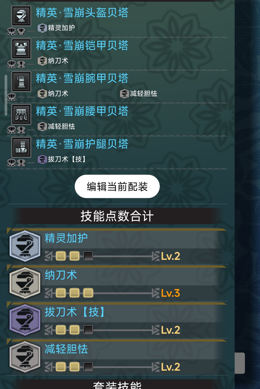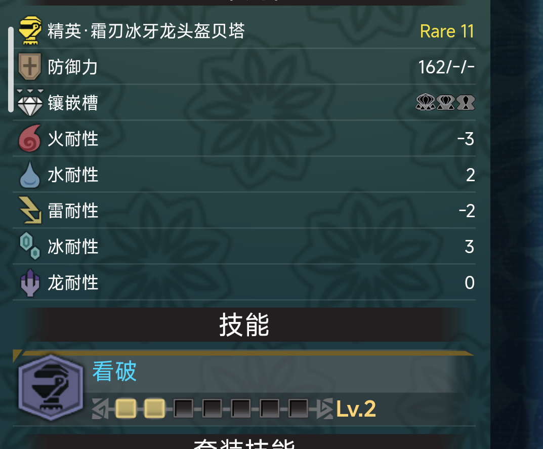 挑選裝備時除了自帶技能和孔位外,套裝效果也是很重要的,例如迅龍3件就能觸發真•利刃,帝王3件就能觸發達人藝,還有片手玩家最喜歡的雪崩伽馬4件的寒氣煉成。