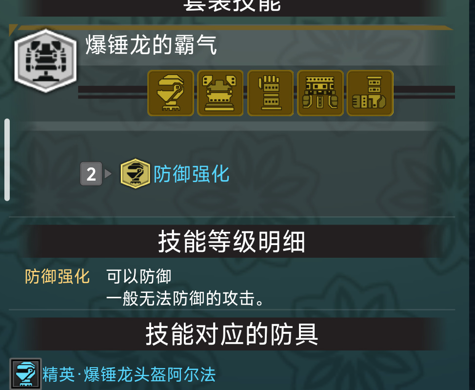 冠突龍阿爾法手+泥魚龍貝塔腿,湊出大劍必須要要的集中3。爆錘龍手+腿,再拿個鐵壁護石,就有5級防禦性能,有鐵壁珠就能省去護石用耐絕護石3,爆錘龍2件套效果還有長槍等帶盾武器必須的防禦強化,可以說是長槍專屬聖遺物。在能做爆錘龍裝備之前,還可以土砂龍頭搭配鐵壁護石3出滿防禦性能。