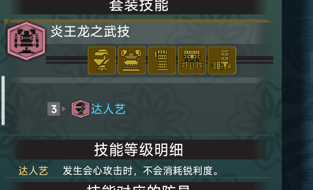 在這一時期,絕大多數裝備都使用炎王龍三件套,因爲他的套裝效果“達人藝”可以讓你在會心的時候不消耗斬味,會心越高效果越好,自身孔位也不錯,自帶技能也不算完全沒用。這一時期我們已經有了一定的珠子基礎。而且最關鍵的是,因爲可以鍊金削擊珠了,輕武器將不比攜帶削擊護石,可以換成耐絕護石之類的。長槍等帶盾武器則鍊金強壁珠之後換成鐵壁護石5,這樣一樣出滿防禦性能和防禦強化。