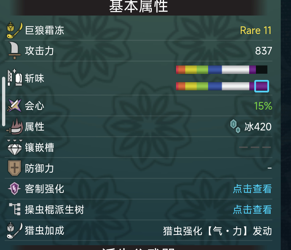 武器選擇霜刃冰牙龍武器,霜刃冰牙龍全身是寶,武器R11意味着更容易剋制吸血,而且自帶會心,紫色斬味。蟲棍還有高貴的巨狼霜凍,所有種類的武器都可以考慮霜刃。