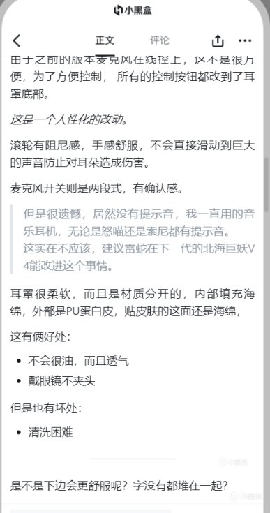 左耳部分有音量的滚轮与麦克风的开关。由于之前的版本麦克风在线控上,这不是很方便,为了方便控制, 所有的控制按钮都改到了耳罩底部。这是一个人性化的改动。滚轮有阻尼感,手感舒服,不会直接滑动到巨大的声音防止对耳朵造成伤害。麦克风开关则是两段式,有确认感。但是很遗憾,居然没有提示音,我一直用的音乐耳机,无论是怒喵还是索尼都有提示音。这实在不应该,建议雷蛇在下一代的北海巨妖V4能改进这个事情。耳罩很柔软,而且是材质分开的,内部填充海绵,外部是PU蛋白皮,贴皮肤的这面还是海绵,这有俩好处:不会很油,而且透气。戴眼镜不夹头。但是也有坏处:清洗困难
