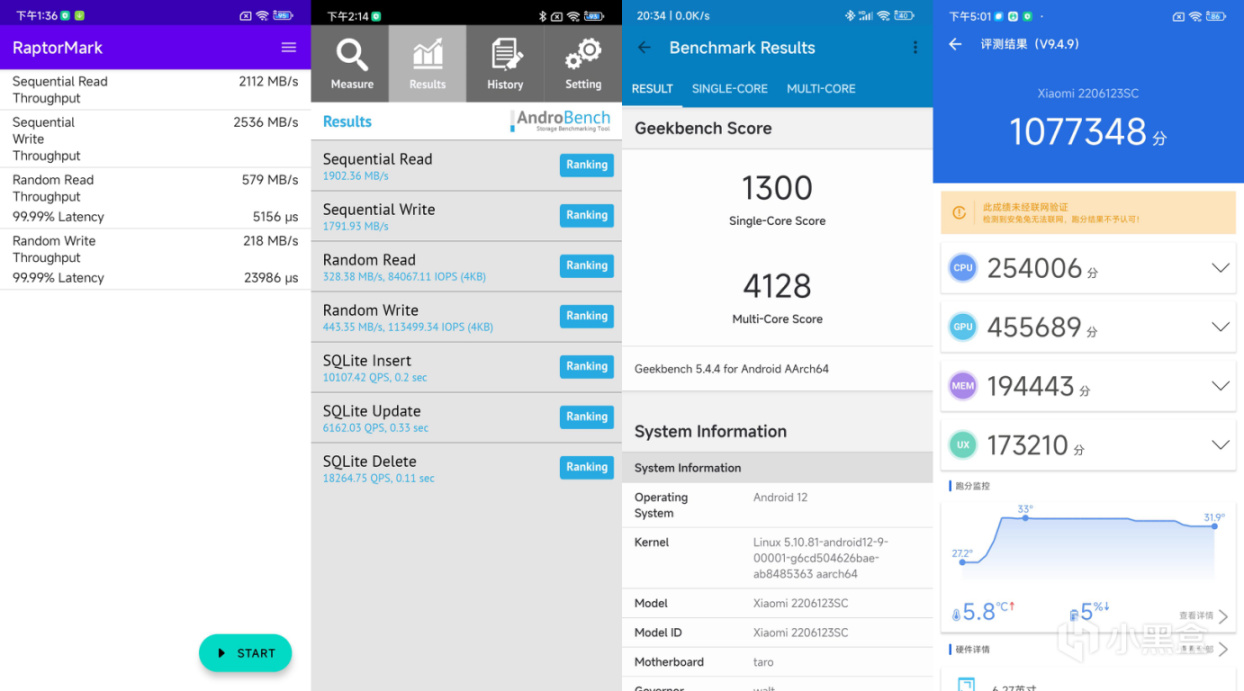 RaptorMark和AndroBench閃存測試如圖,Geekbench 5單核1300,多核4128,安兔兔綜合跑分1077348。