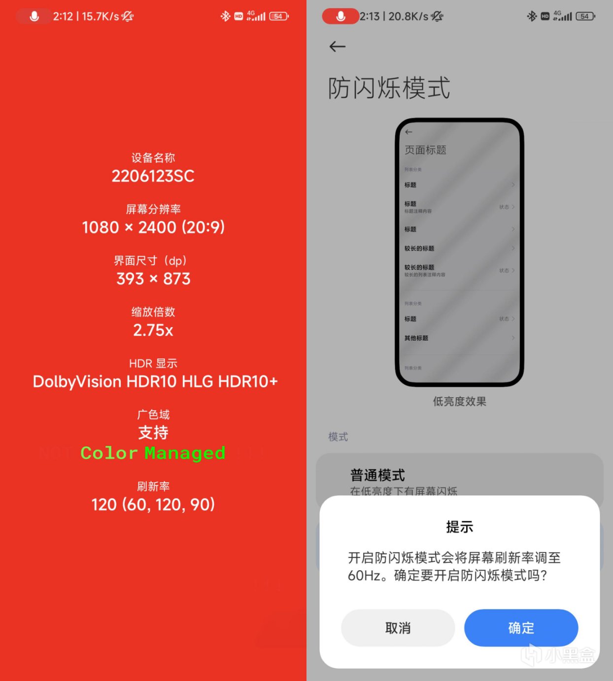 支持防閃爍模式(DC調光),但默認不能和120Hz高刷同開。