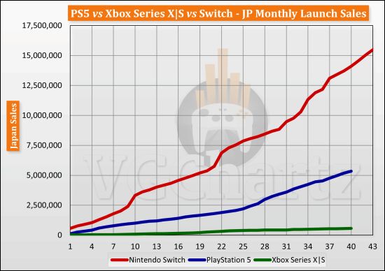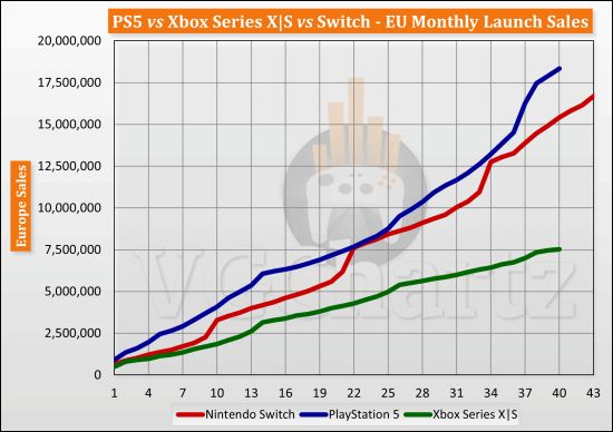 VGChartz近期发图对比PS5、XSX|S和Switch发售40个月的销量。