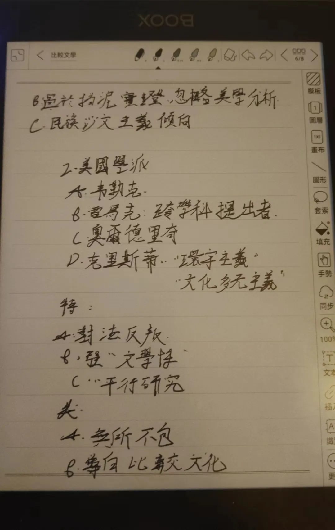 以我使用文石的笔记为评价标准,我觉得是ok的,我首先是一个左撇子,文石的笔记界面的可自设性还是满高的,在调整后可以流畅地记录,而且可以传入云盘,在其他设备上也可以查阅,其手写笔的使用我觉得还是可以的,其原理稍稍与电磁笔不太相像,是靠前端的磁芯来书写的,原理类似于小时候玩的磁画板,书写的延迟与卡顿都比较低。