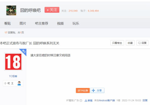 甚至就连和敖厂长成名系列“囧的呼唤”同名的贴吧,都站出来声明,和敖厂长做切割。