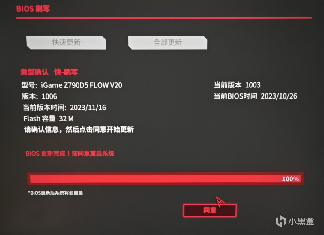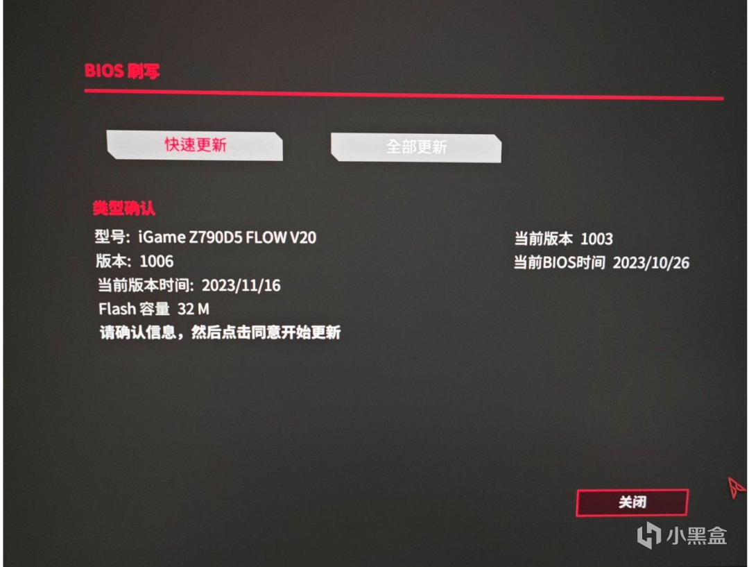 BIOS升级,比我之前6月使用CVN B760M要操作简单了,不需要先关闭固件ME刷写, 点击工具选择BIOS升级,选择U盘下载好的BIOS 件,点击快速更新即可。